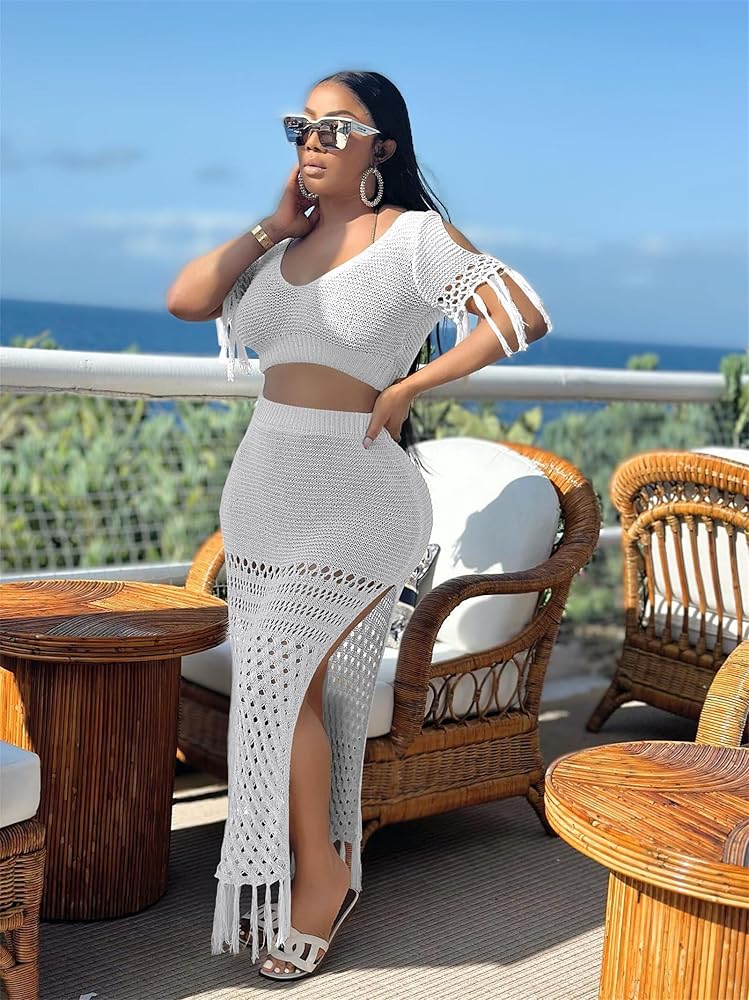 DESIGN:Two piece outfits for women,2 piece outfits for women,two piece sets for women summer,matching sets for women,crochet outfits for women,summer crochet mini dress sets,Sexy Crochet Tassel Split Midi Dress & Summer V Neck Knitted Hollow Crop Tops,high waist elastic dress sets,dresses for women 2024,streetwear women,club outfits for women,you can match it with your any other tops/bottoms!