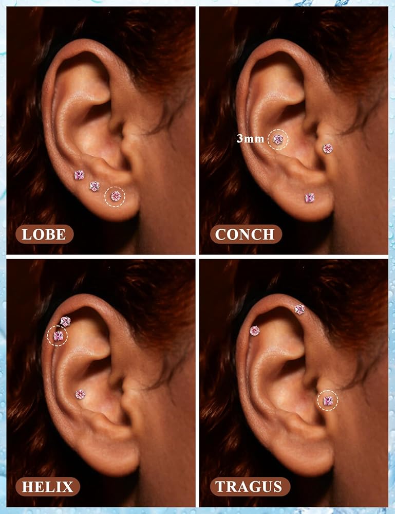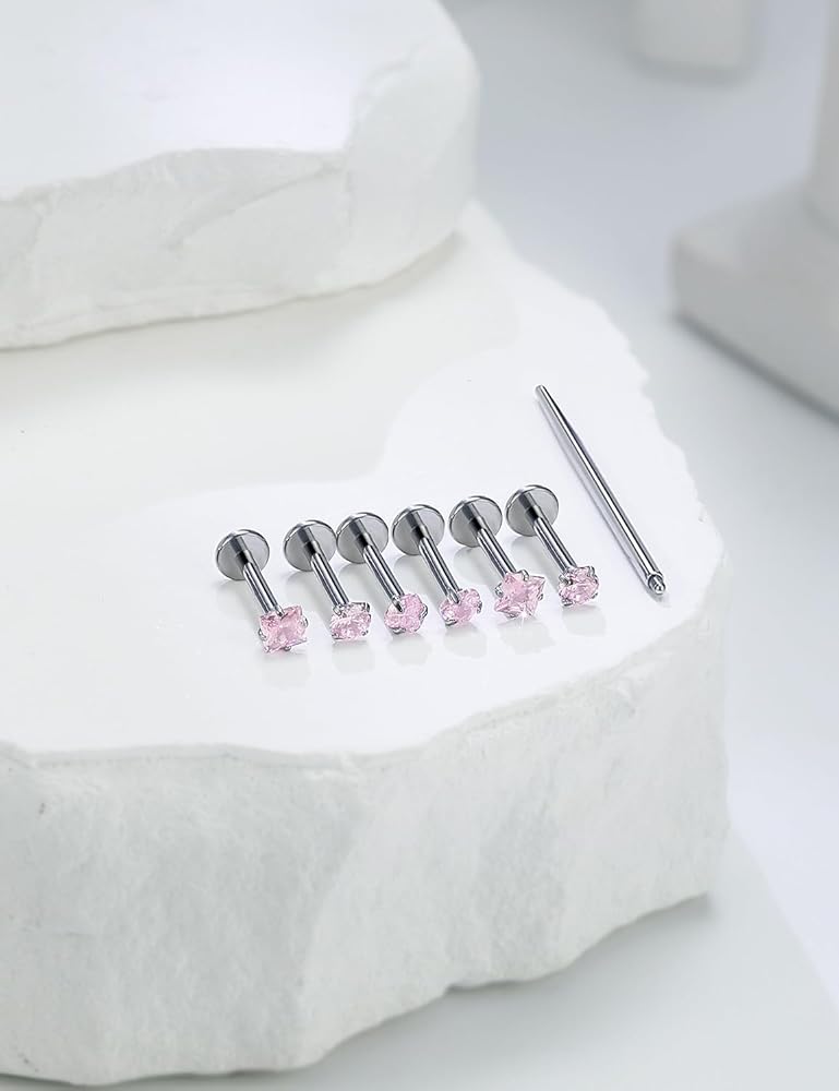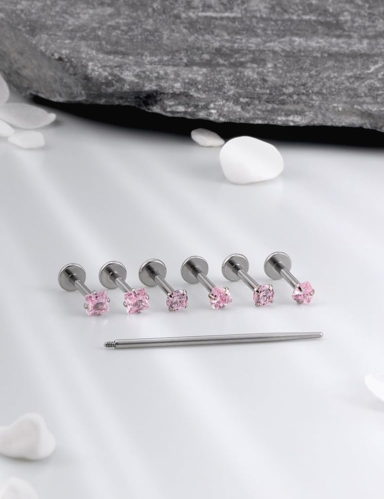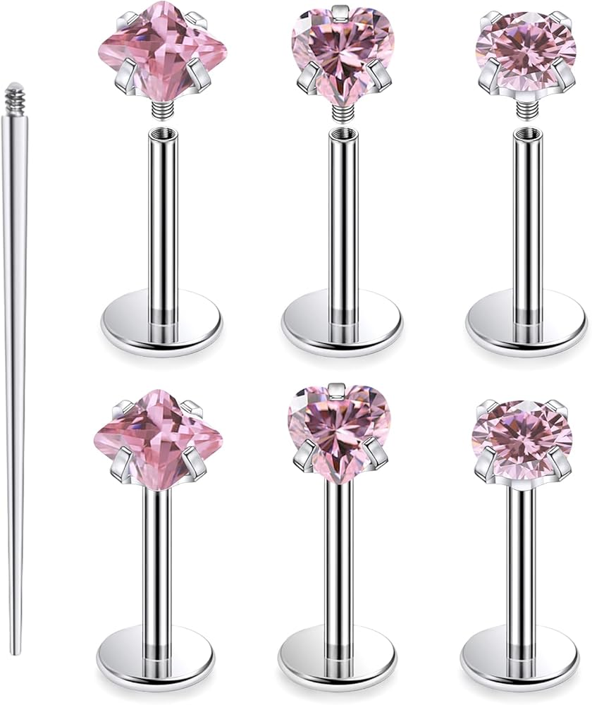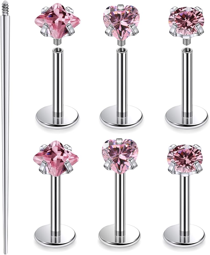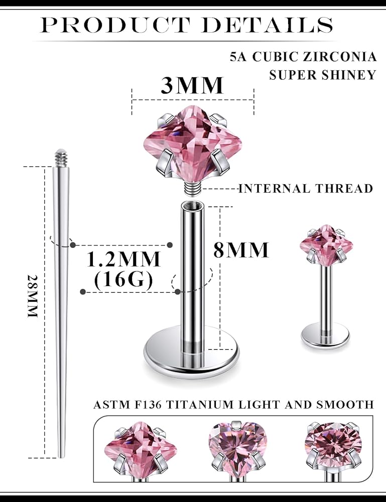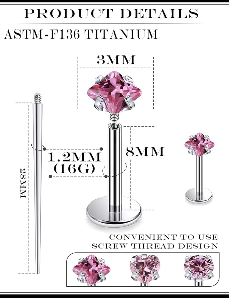 【Order includes】: 3 Pair 16G ASTM F136 Titanium internally threaded Flat Back Earring, One Pair Round CZ Lip Rings, One Pair Heart CZ Labret Jewelry and One Pair Square CZ Snake Bites Piercing Jewelry,You Can Mix and Match Freely, 1PC Titanium Piercing Taper, can be easily screwed in and off.