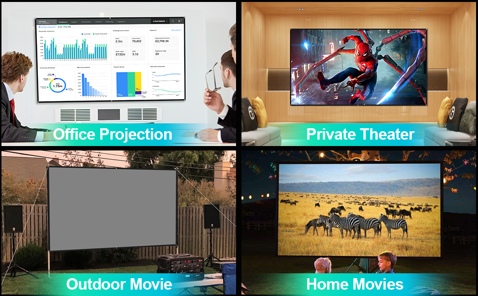 【مادة رفض الضوء المحيط بنسبة 100%】 تستخدم شاشة العرض مقاس 120 بوصة لمسة ناعمة ومواد طبقة بصرية سميكة قابلة للتمدد لضمان رفض الضوء المحيط بنسبة 100%، وجودة الإسقاط أكثر وضوحًا وإشراقًا من المواد البيضاء غير اللامعة الأخرى.