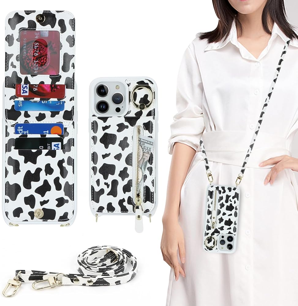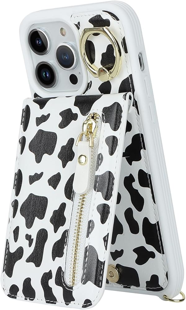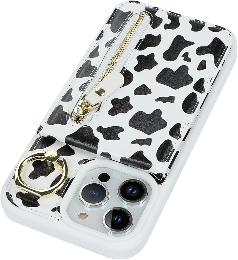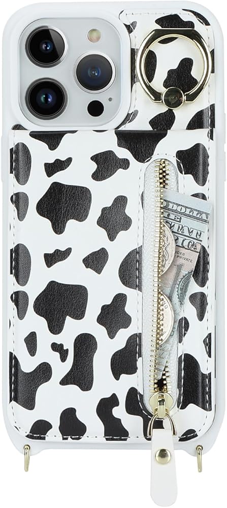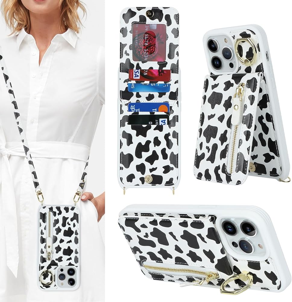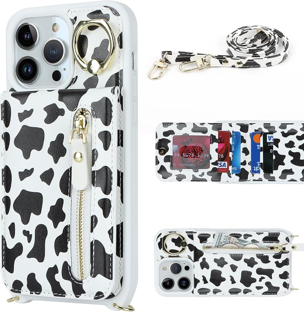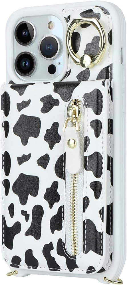 for iPhone 13 pro max Phone Case with Card Holder and Strap for Women, Crossbody Bag with Ring Stand Zipper Wallet Case for Apple13promax Purse - Black Cow Print