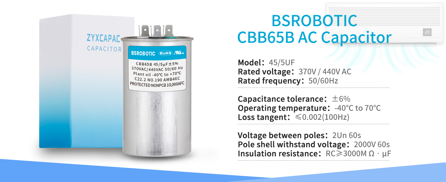 【45+5 uF ±5% MFD 370/440 V Dual Run Round Capacitor】Replace 370 and 440 VAC capacitors effortlessly with our CBB65B dual run round AC startup capacitor. Whether it's for motor operation, fan startup, or direct condenser usage, this capacitor has you covered.