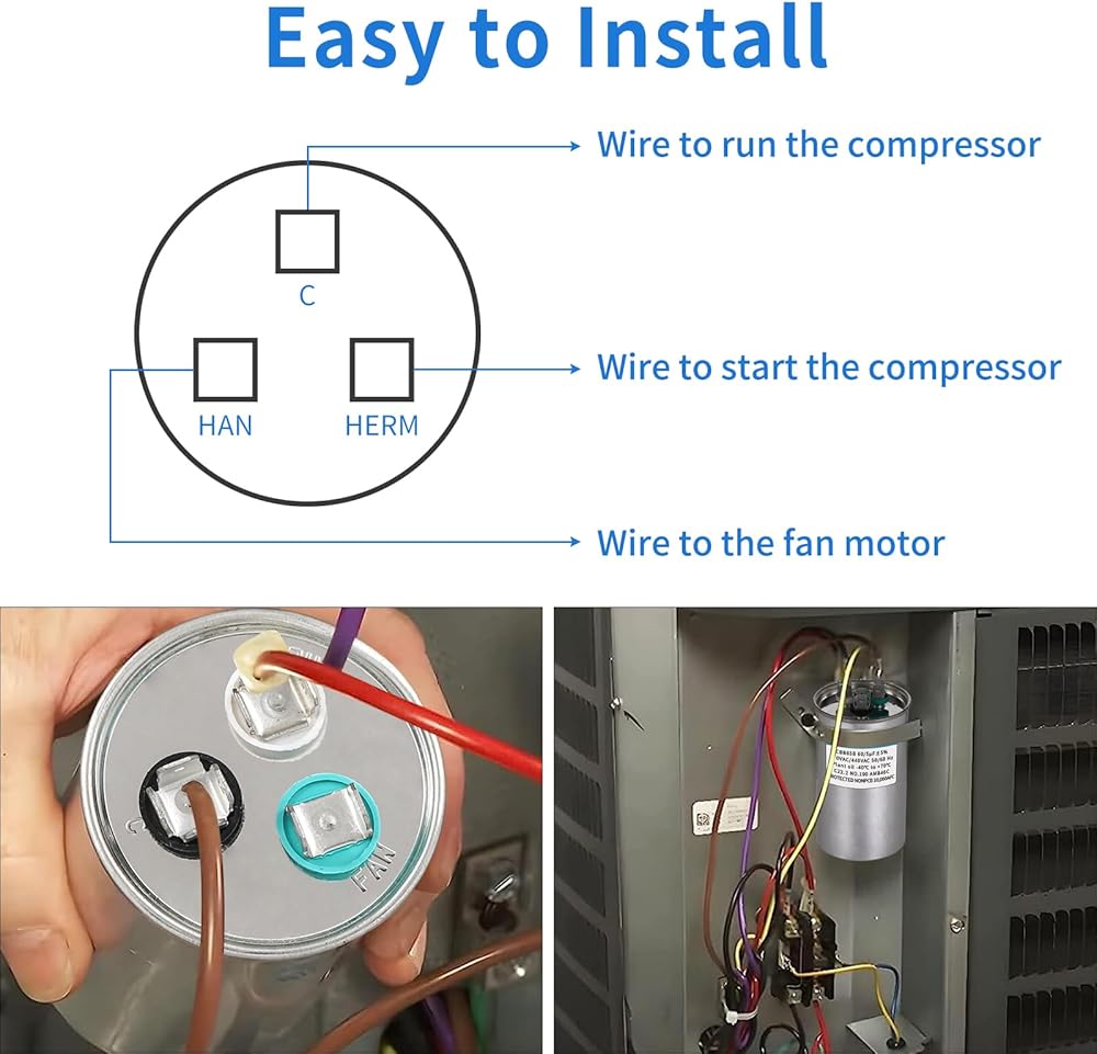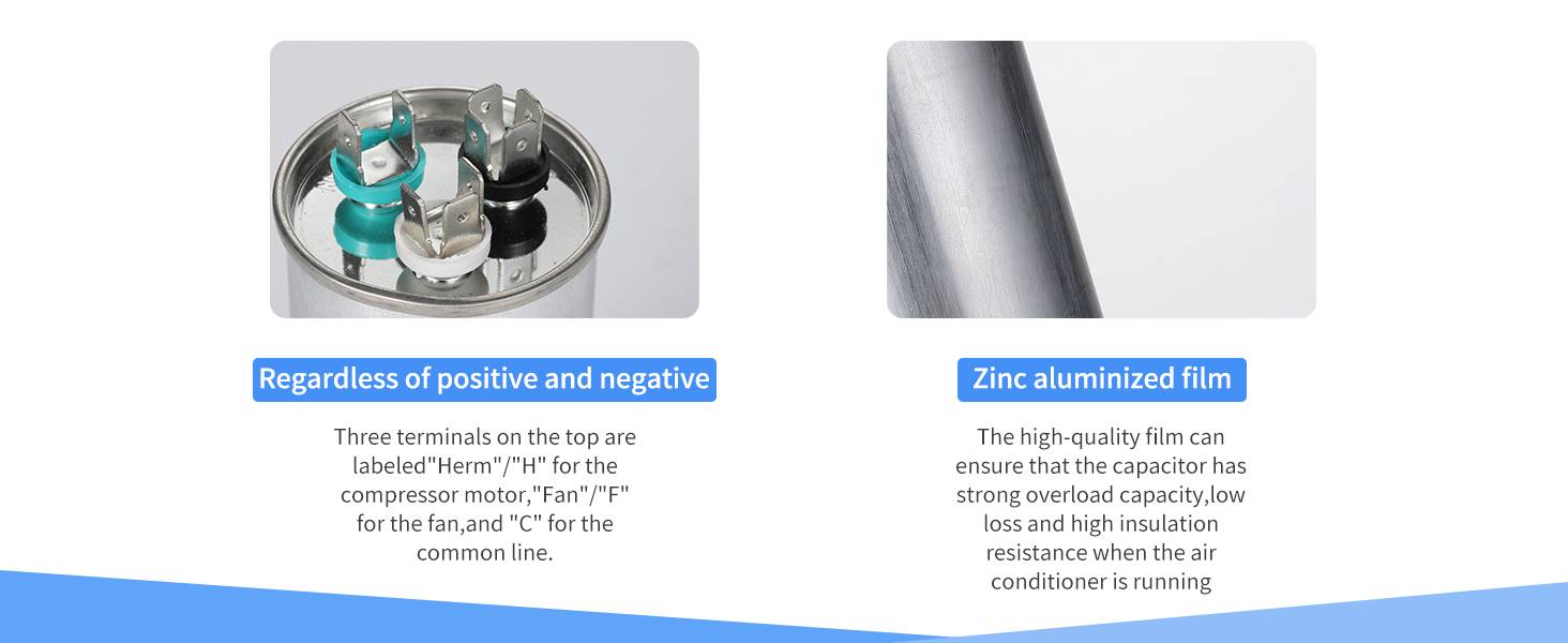 【Safety and Easy Installation】10,000 AFC safety rating, eco-friendly vegetable oil filling, cylindrical aluminum casing, and pressure-isolating explosion-proof design, our capacitor ensures safe use. The top is equipped with three terminals labeled "Herm"/"H" for compressor motors, "Fan"/"F" for fans, and "C" for the common line. Simply disconnect the power, label the wires, connect the new capacitor, replace the old one, and turn on the power. You'll only need 10-15 minutes for the replacement.