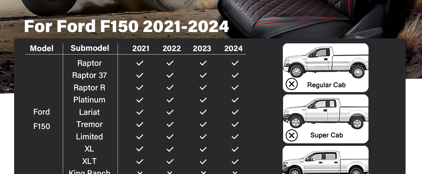 【وسائد هوائية متوافقة】جوانب غطاء المقعد مكشوفة جزئيًا لضمان توافقها مع الوسائد الهوائية. يتم تخصيص أغطية المقاعد ذات الغطاء الكامل هذه بدقة وفقًا لأحجام مقاعد السيارة الأصلية، مما يغطي المقاعد الأصلية بدقة. لذا فإن أغطية مقاعد السيارة Ford F150 الخاصة بنا لا يمكنها حماية مقاعد سيارتك بشكل جيد فحسب، بل تضمن أيضًا سلامتك الشخصية في أي حوادث.