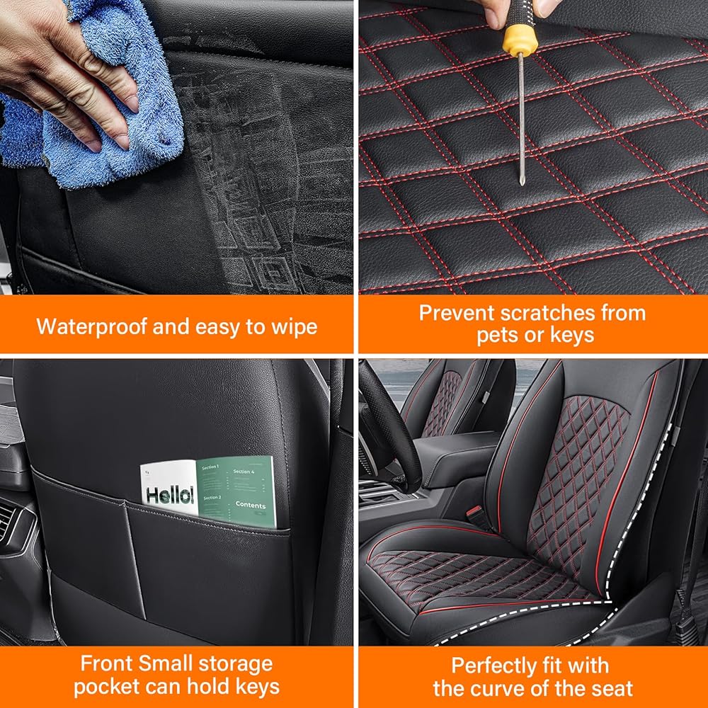 【مادة ممتازة】مصنوعة من جلد صناعي مقاوم للماء ومقاوم للاهتراء، مما يحمي سيارتك من الخدوش والانقسام والأوساخ. الجزء الصغير من غطاء مسند الظهر وغطاء مسند الرأس مصنوع من القماش لمزيد من التوافق. يتميز السطح الجلدي بمقاومة جيدة للتآكل لحماية المقعد من الخدش بالمفتاح، ويمكن تنظيفه بسهولة عن طريق مسحه بمنشفة مبللة.
