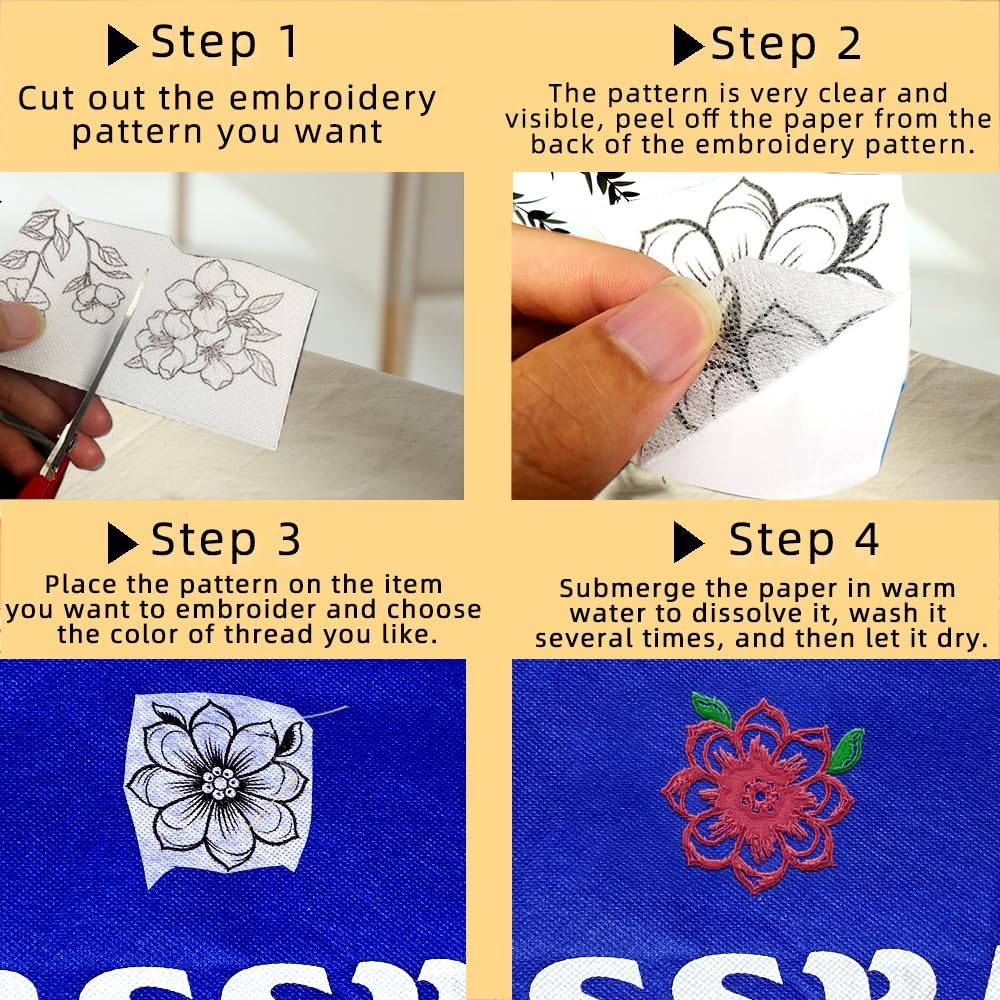 EASY TO USE: 1. Select and cut out the pattern; 2. Tear off the backing paper, paste it on the project area and start sewing; 3. Soak it in warm water to dissolve the stabilizing paper and let it dry; Not only is it quick and easy to use, it's also less likely to leave a mark.
