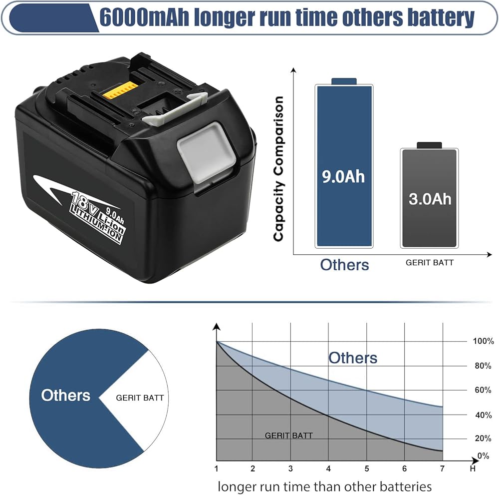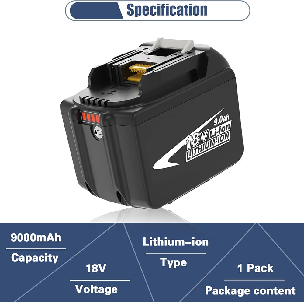 【Higher Capacity】Compared with the 6.0Ah battery, the replacement for 18 volt Makita 9.0Ah battery provides longer running time, make you work more efficiently without charging again and again.