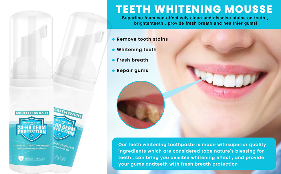 [Teeth Whitening Mousse] Mouthwash can help you remove food debris from the mouth, intensive stain removal, effectly repair and protect teeth and make your teeth completely white, no matter your teeth are yellow or black. Packaging includes :2 pcs*Teeth Mouthwash