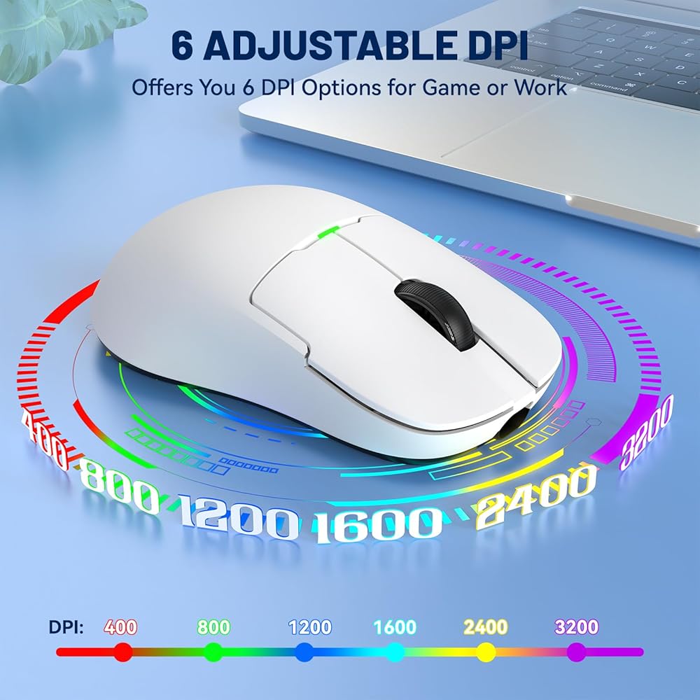 [Lightweight & Ergonomic Design]:Weighing just 56 grams,allows the gamers to move the pc mouse quickly.This white mouse adapt with advanced lightweight material case and ergonomic medium size design,which can minimize the burden of hands after intense gaming or extended work sessions.