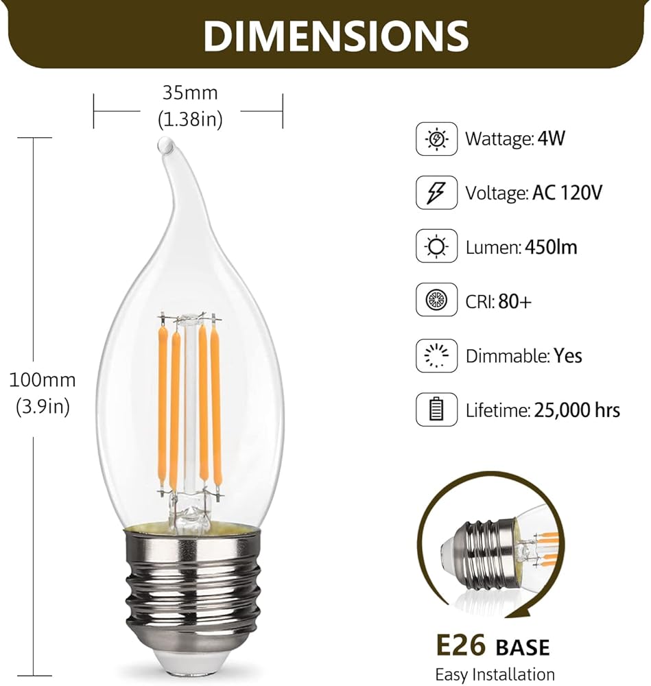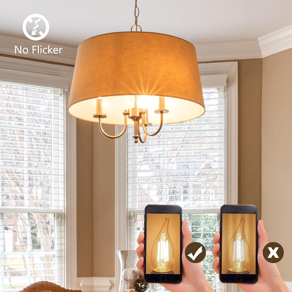 【Dimmable】B11 Candelabra LED Bulb is compatible with most dimmers, Smooth dimming from 10-100%, the brightness can be changed between 80-450 lumens, without radiation and flicker, great for chandeliers, ceiling fan, wall sconces, pendant light, foyer light.