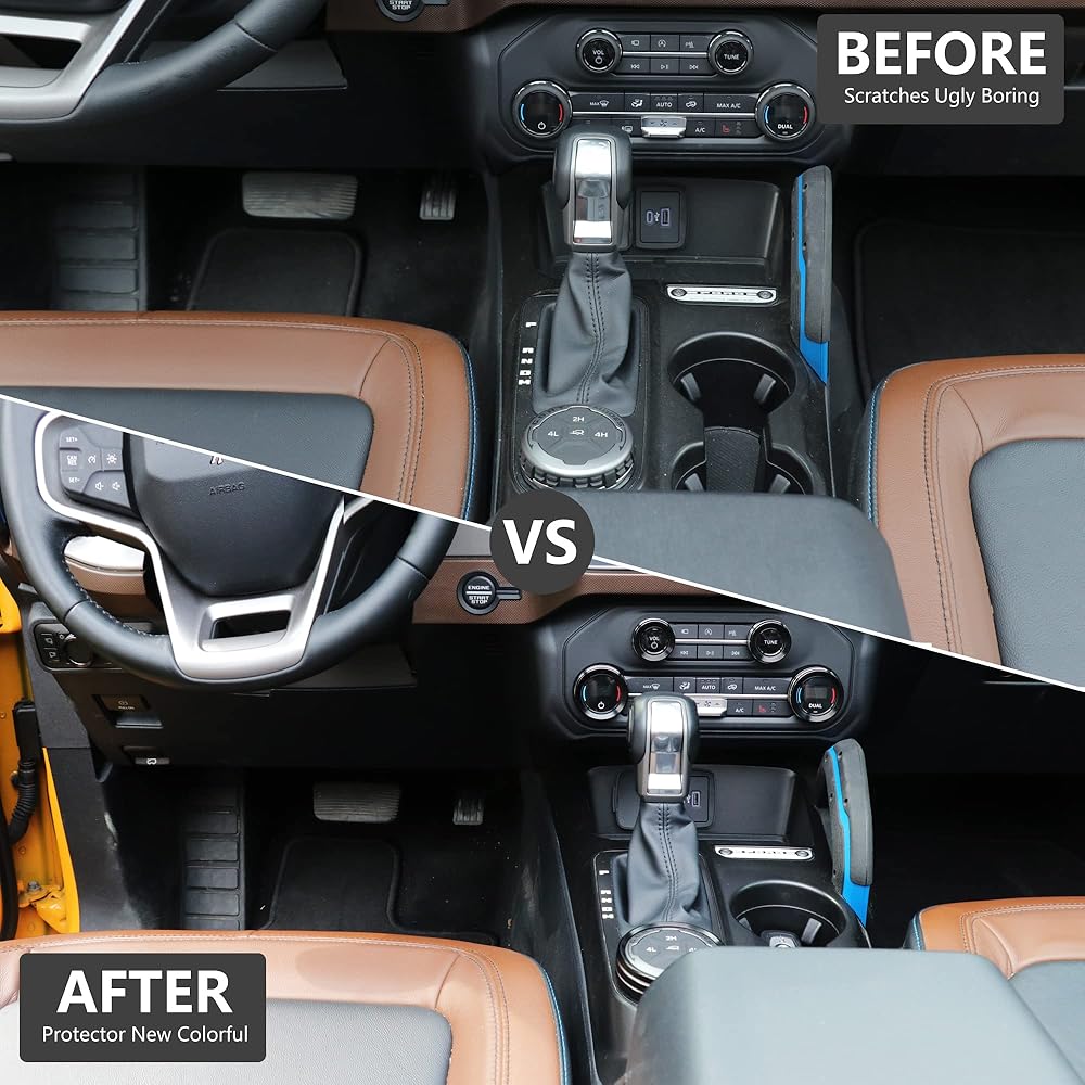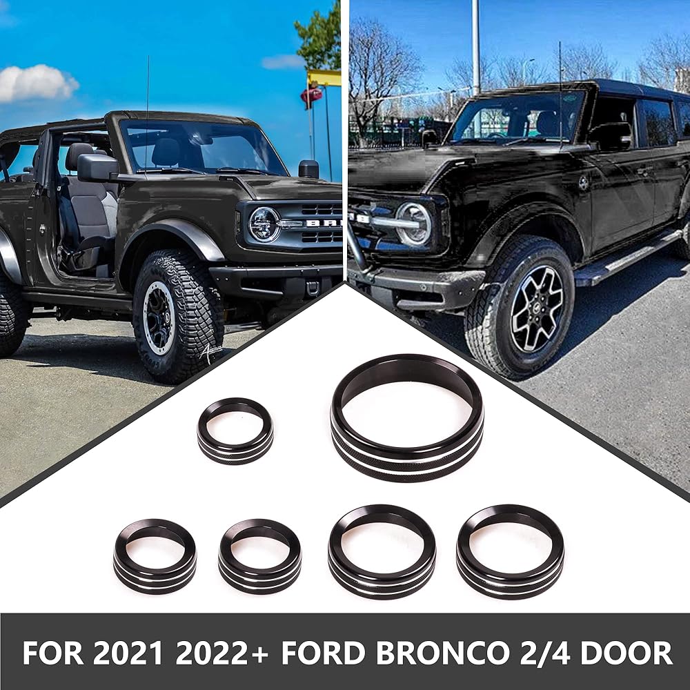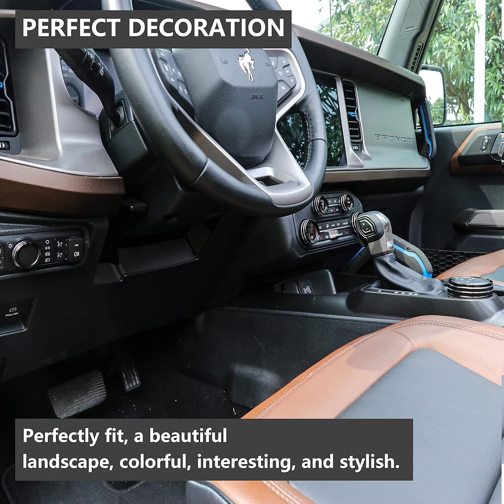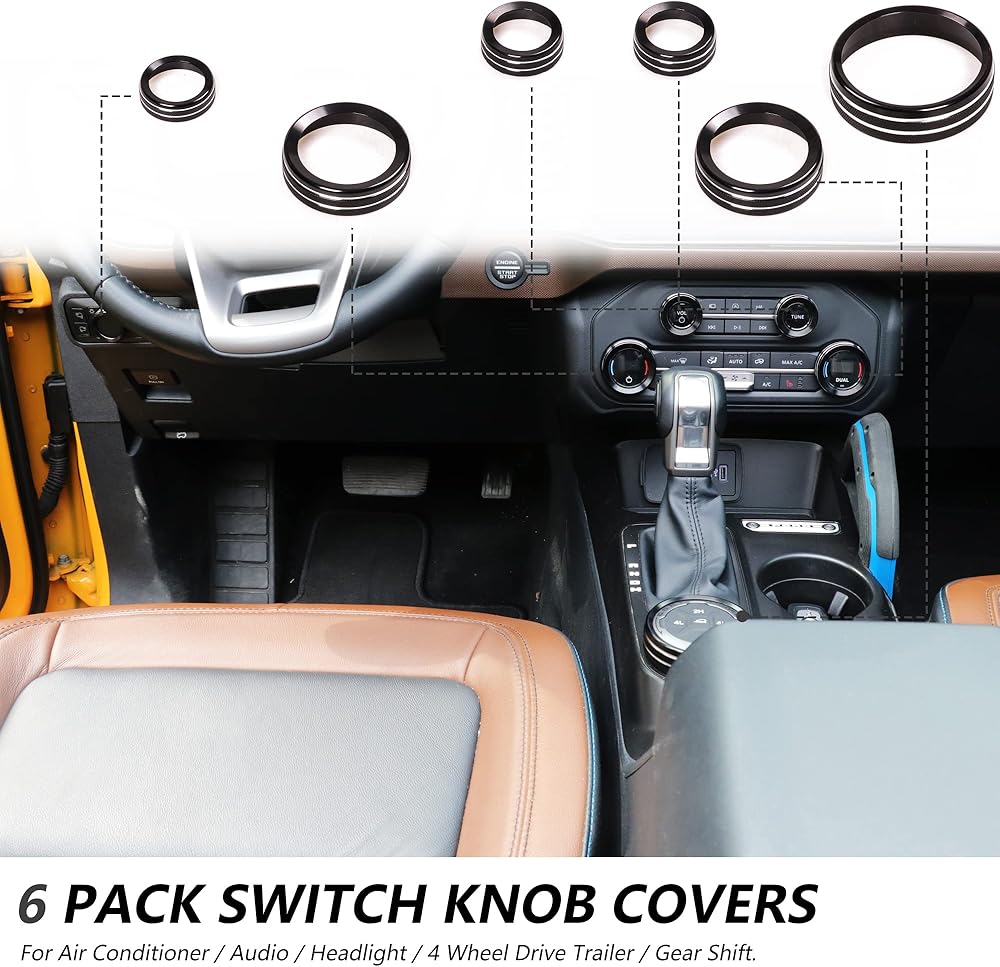 FITMENT--1 x headlight, 1 x four-wheel drive, 1 x gear shift, 2 x air conditioner, 2 x audio switch knob cover trims are customized for 2021 2022 2023 2024 New Ford Bronco Sport interior accessories. (CAUTION!!! NOT FOR BRONCO OFF-ROAD VERSION).