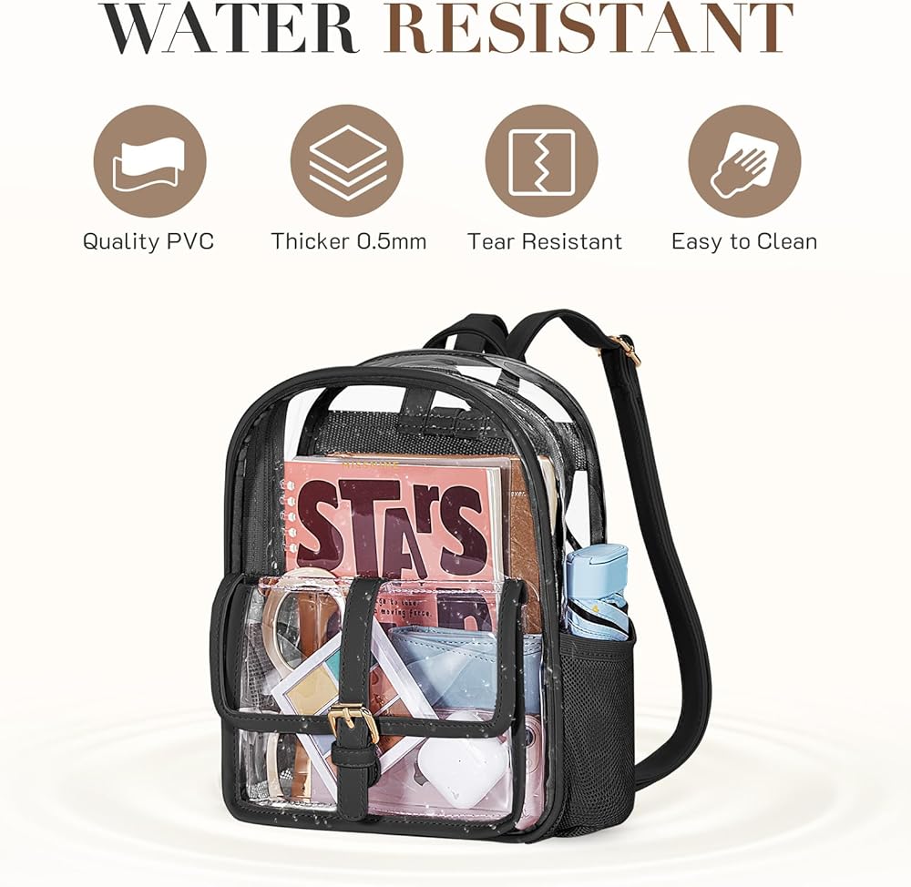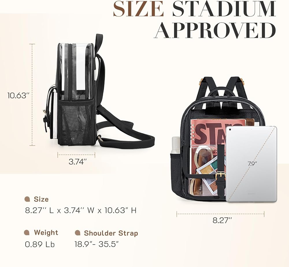 【Clear Backpack for Stadium Events】The cute clear stadium bag measures 8.27" L x 3.74" W x 10.63" H. It is completely transparent, compliant with various venue regulations, making it ideal for concerts, football games, sporting events, festivals, and large gatherings, etc., allowing for a quick and easy security check