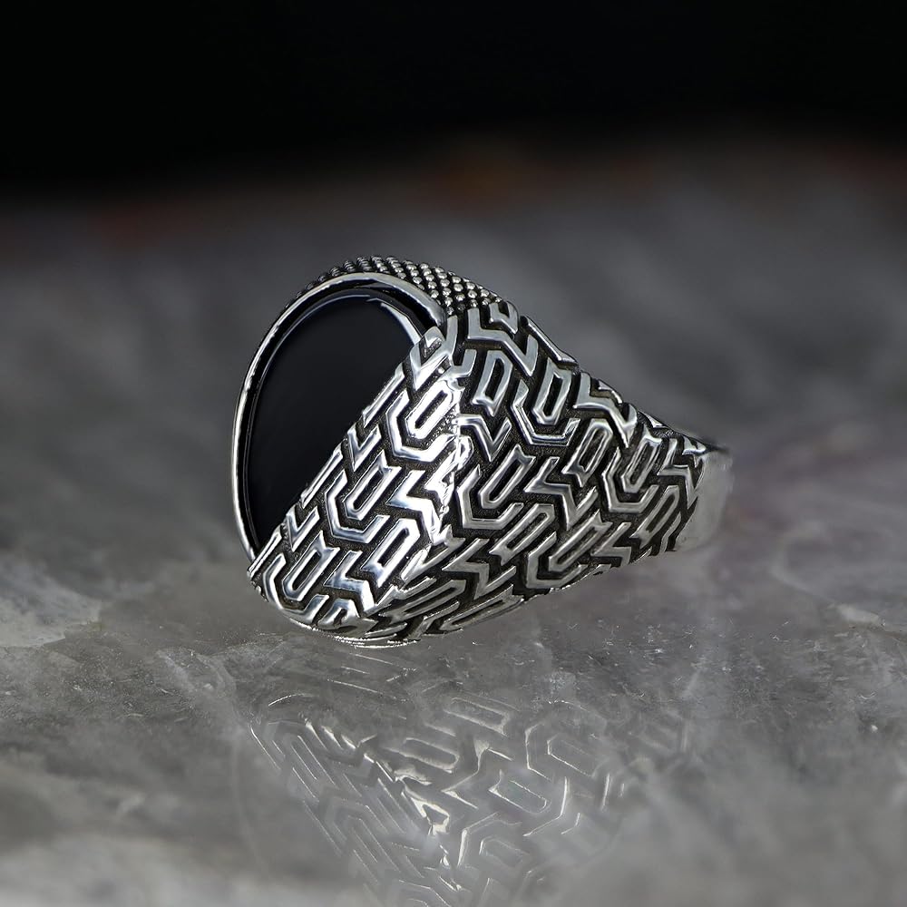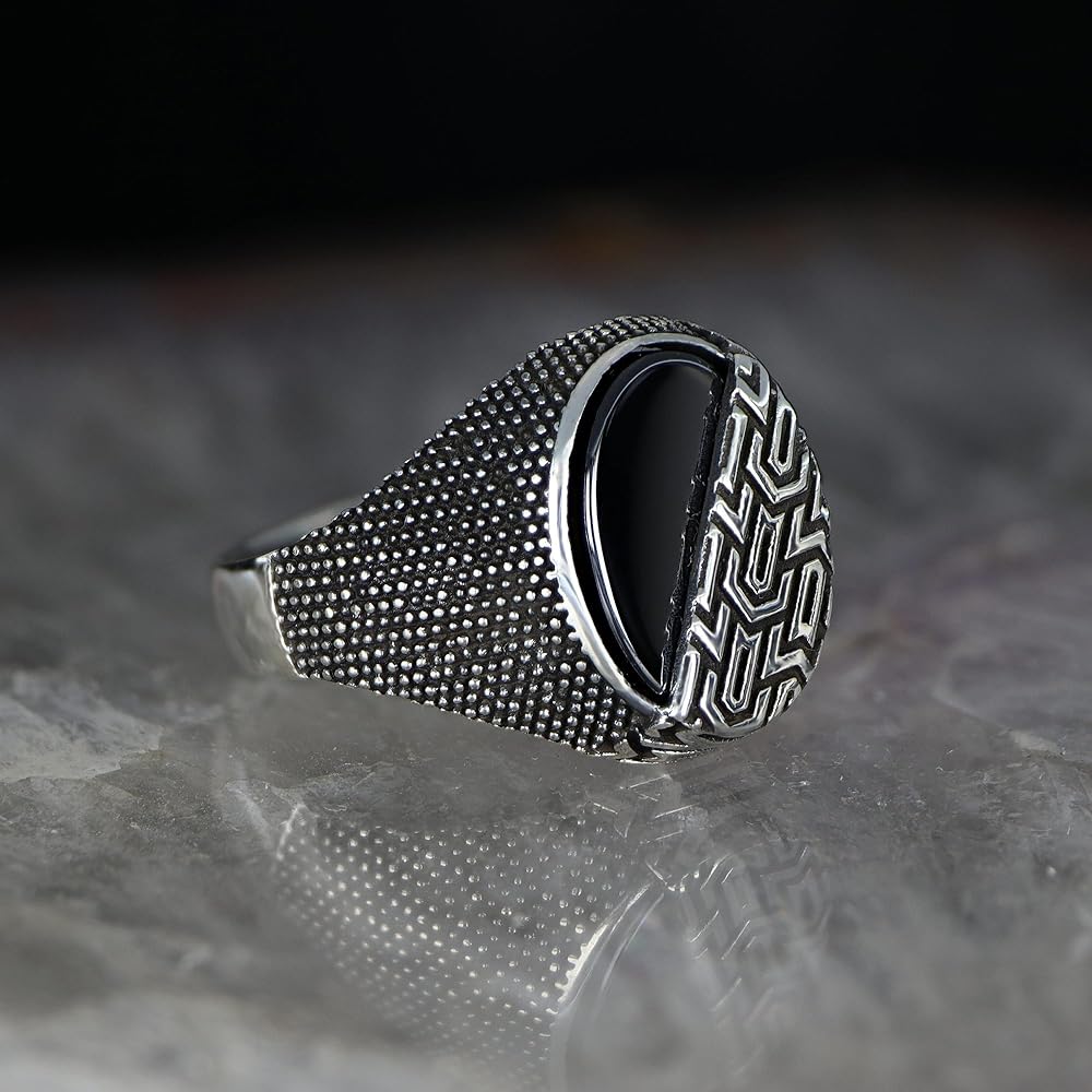 • The ring features a unique two-sided design, with each side showcasing. Meticulously handcrafted by Meir Silver, the KsrModa Genuine Black Onyx Stone Unique Two Side Design Men's Silver Ring showcases exceptional craftsmanship and attention to detail.a different pattern, allowing for versatile styling options and adding a dynamic element to the overall aesthetic.