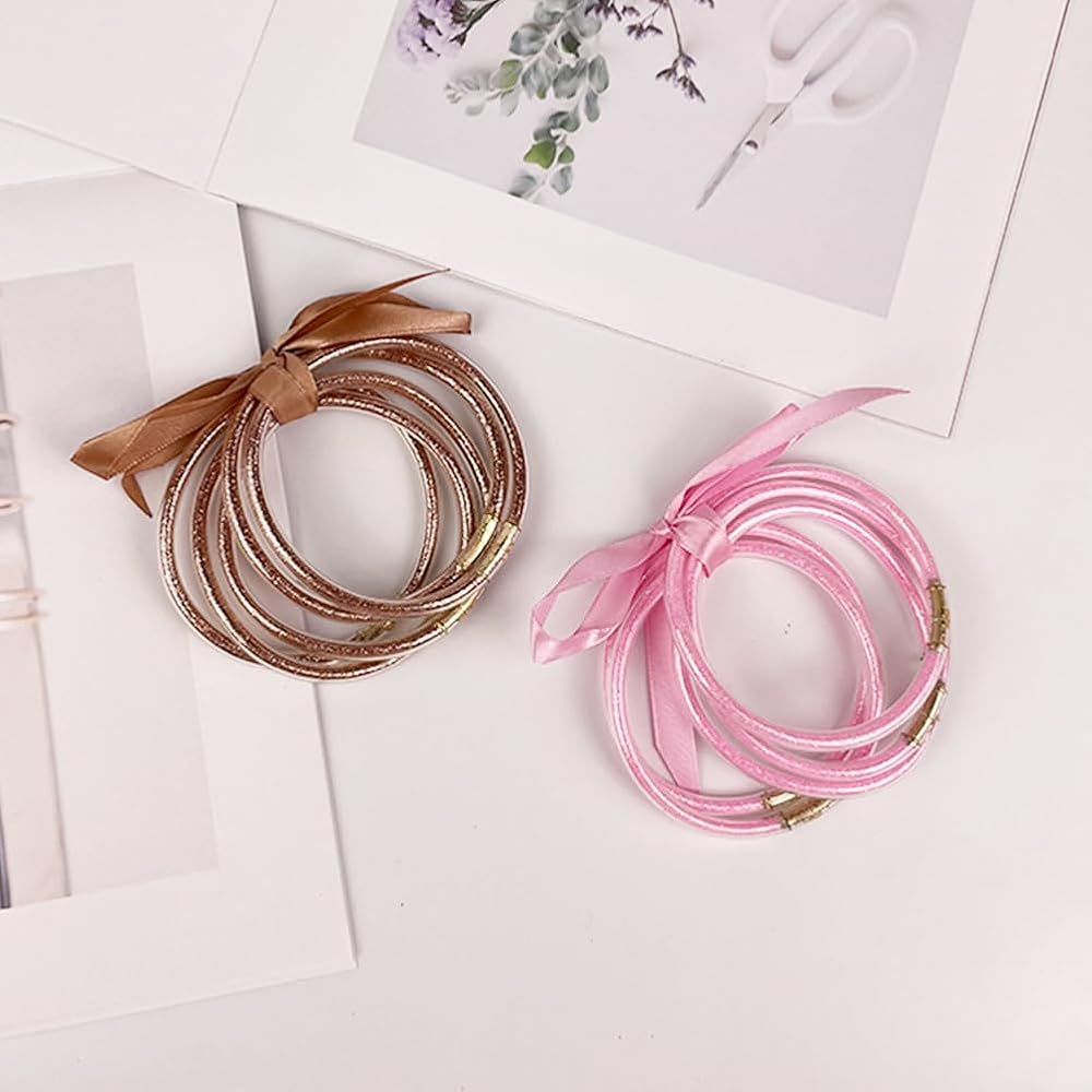 【Glitter Bracelet Set】: You will receive 10 pieces of soft glitter silicone bracelets, 5 pieces bracelets in a set, tied with a ribbon and removable, you can freely combine several bracelets tied together, wearing this glitter bracelet will make you look beautiful around the crowd.