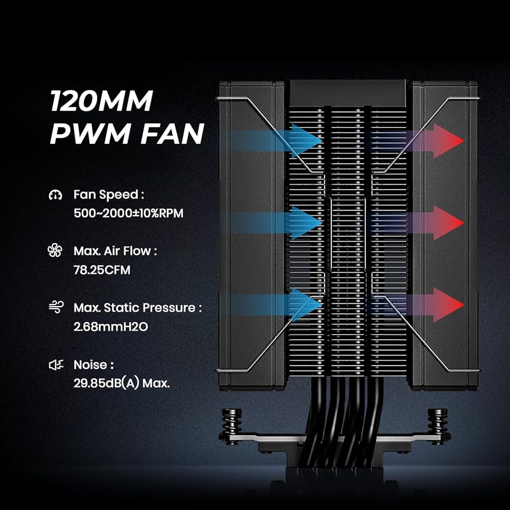 【Better Heat Dissipation】The CPU air cooler features a single tower with 4 heat pipes and two 120mm FDB fans in a push-pull configuration to deliver excellent heat dissipation from the CPU.