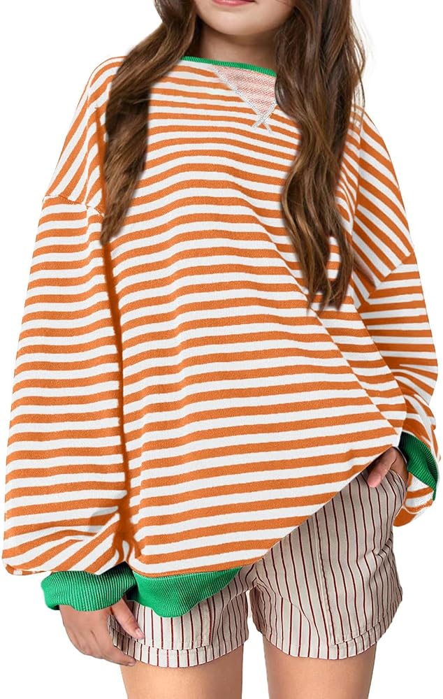 Feature: Girls striped sweatshirt, long sleeve drop shoulder top, ribbed neck, deep v neck, low cut, casual blouses, relaxed fit ,cold color.