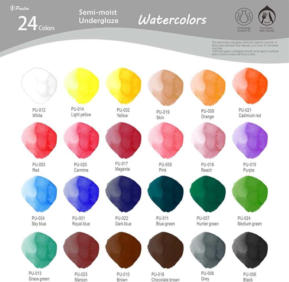 The Pasler Underglaze Watercolor Set 24 colors,the colors are concentrated,intense and opaque, The color is semi-moist,When using it, use a brush dipped in water to apply it to the paint,take it out of the pot after the paint dissolves,and then brush it directly.on the thick soup.Thin with wate for warercolor effects,Other hues,shades and tints are obtained by intermixing.