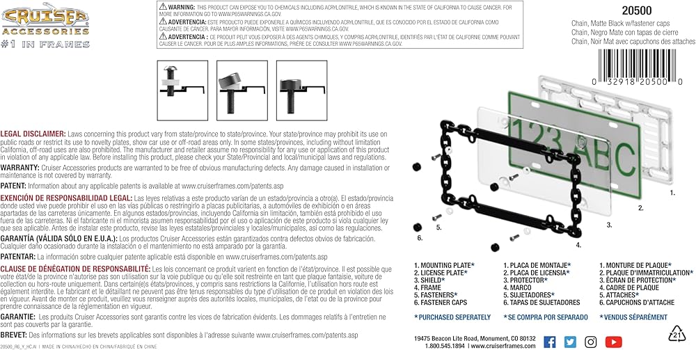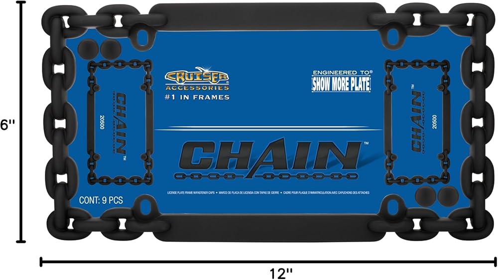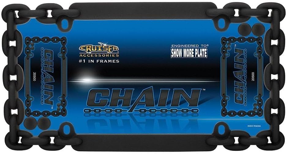 This frame features a chain design with double bars that allows you to personalize or engrave your message. Cruiser Accessories is a family owned business that has been manufacturing and selling license plate frames for over 30 years. Through innovation, attention to detail and many patented designs, Cruiser has evolved into the largest supplier of license plate frames, novelty plate shields and mounting hardware in the automotive aftermarket. Cruiser's product line also includes both standard and exclusive Star Pin locking hardware, designer fastener caps, mounting accessories, motorcycle frames and 3d-Cals decals. Let Cruiser Accessories complete your ride's look today!