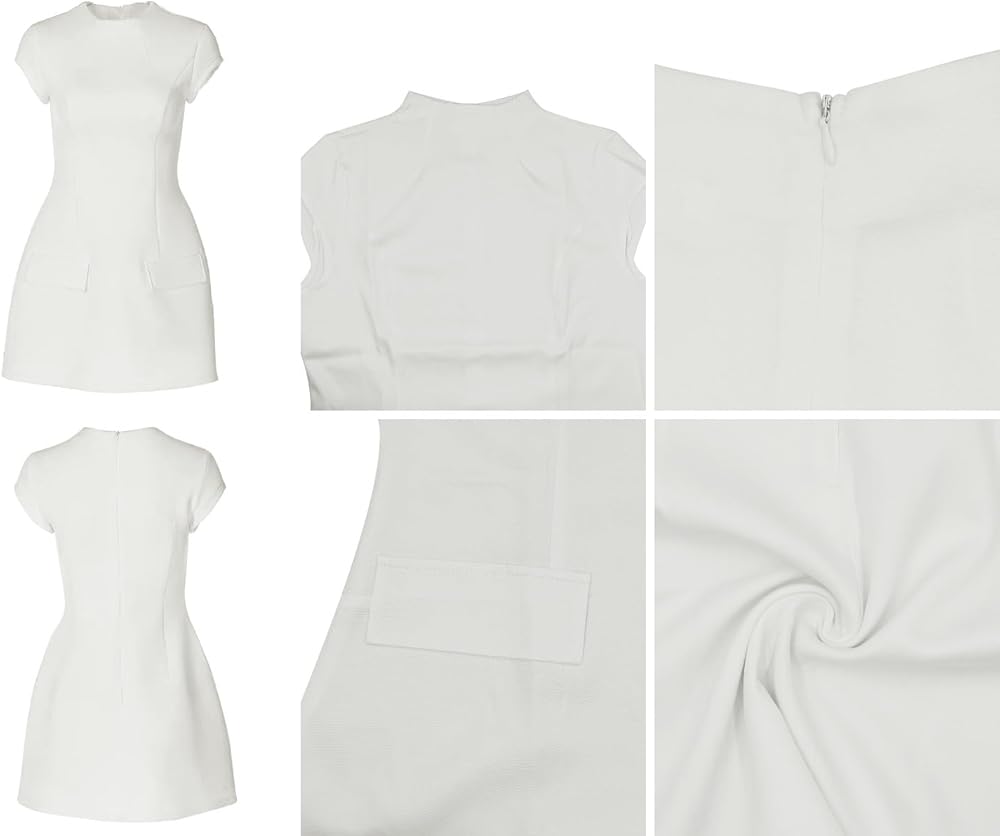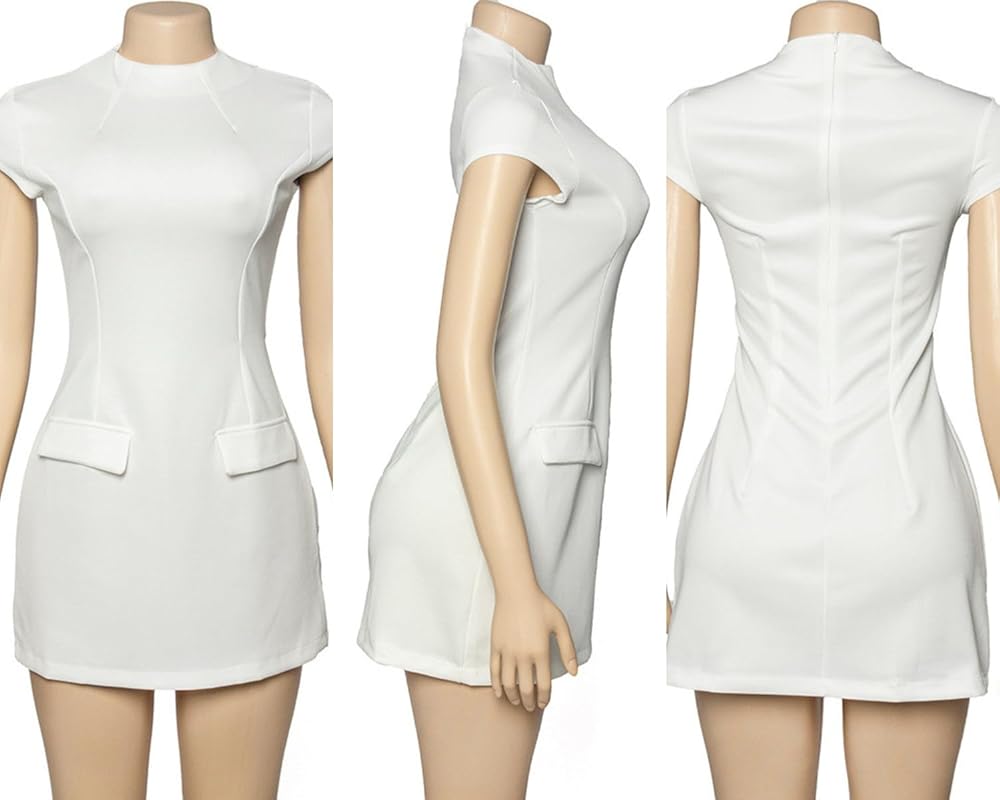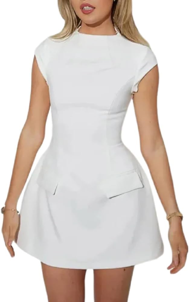 Suillty Sexy Women Pockets Mini Dress O-neck Short Sleeve A-line Dresses for Female Party Office Lady Chic Commuting Robes
