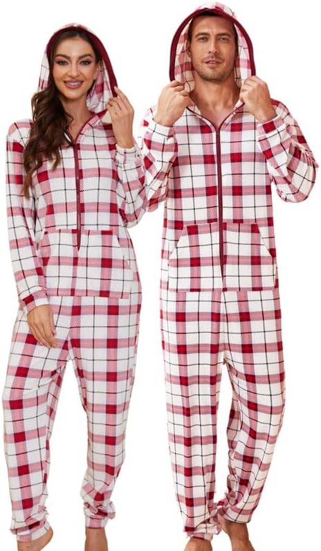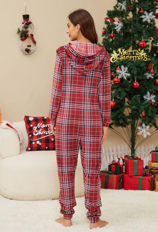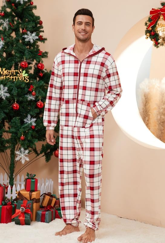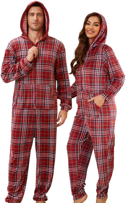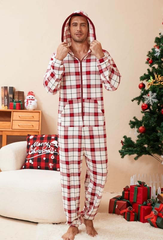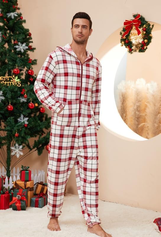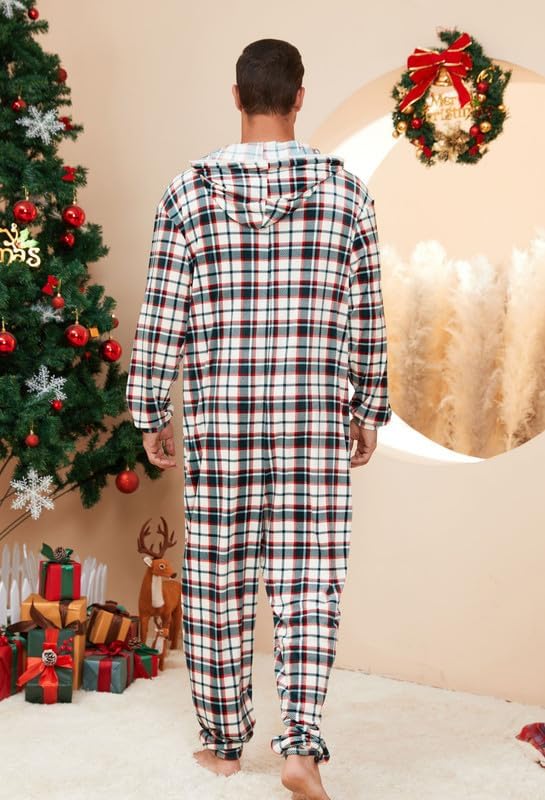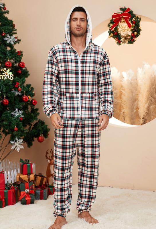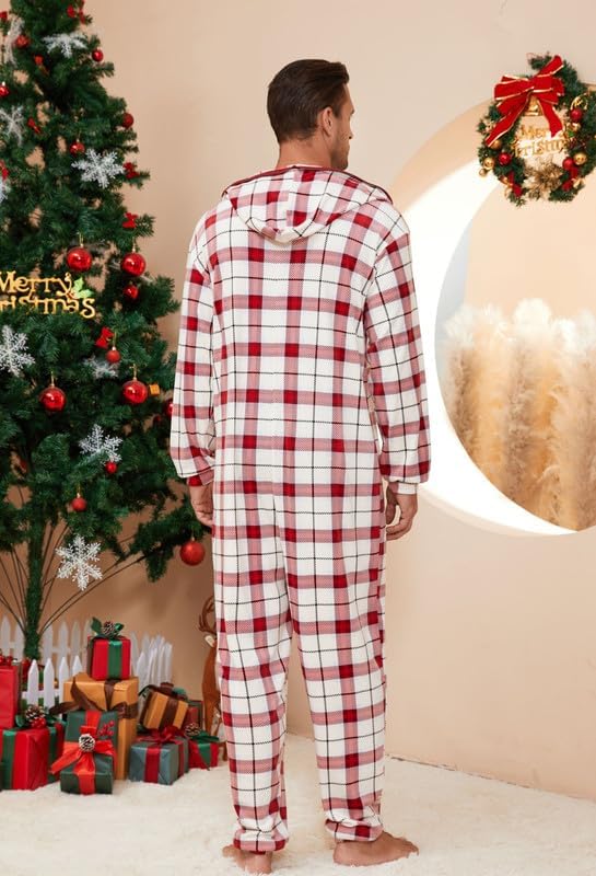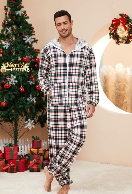 🎅🏻Relaxed Fit: Enjoy the relaxed fit of fleece hooded pjs onesie with a contrasting color zipper for easy wear. The plaid pajamas of hood offer ear coverage or wind protection, perfect for lounging or outdoor activities. The long zipper ensures easy wearing and removal.