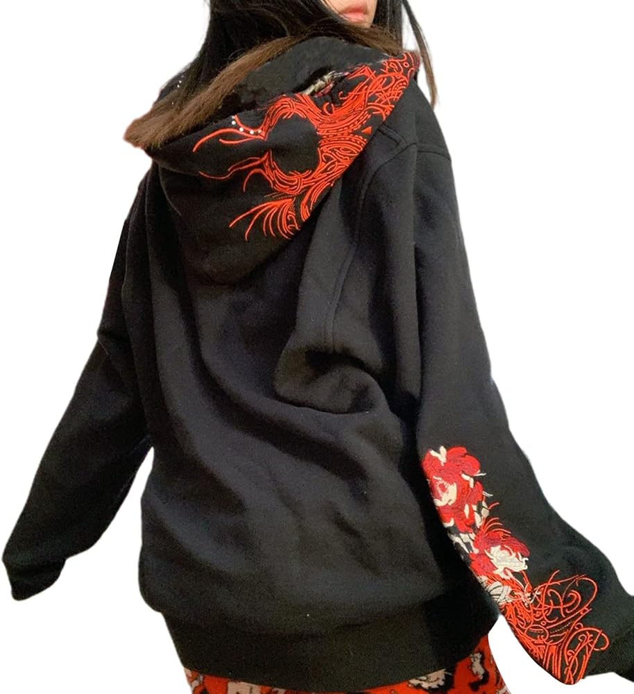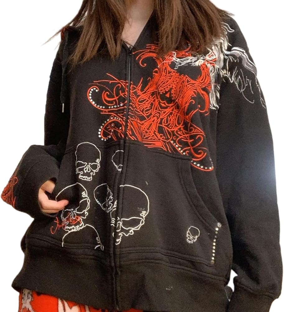 Women Y2K Skull Hoodie Graphic Zip Up Grunge Aesthetic Hoodies Casual Vintage Oversized Sweatshirt Harajuku Jacket