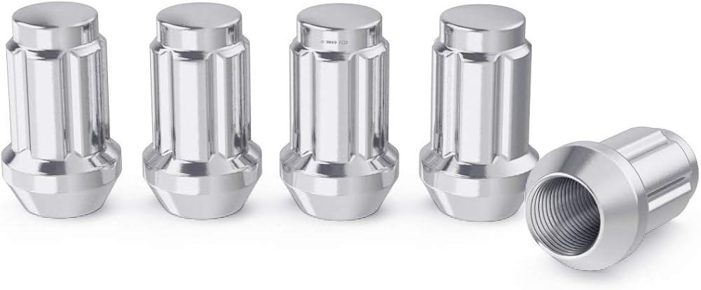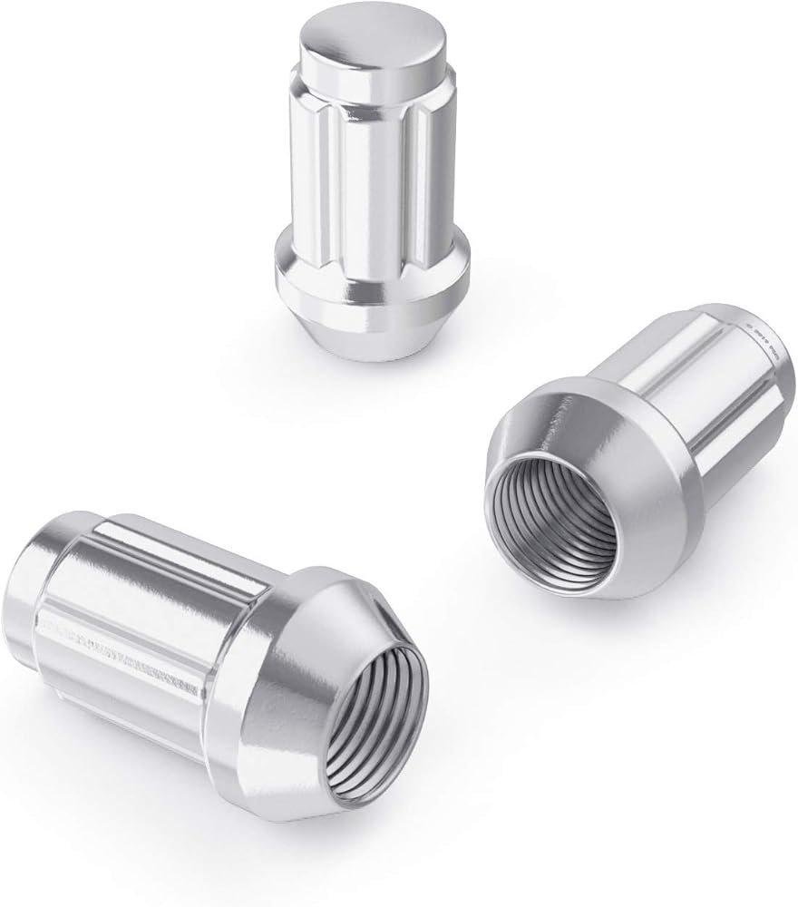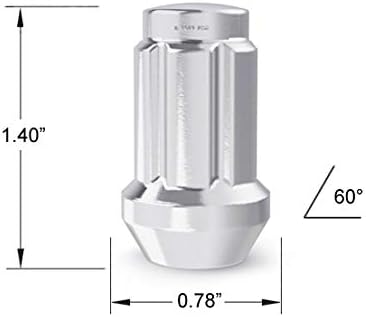 Total Length: 1.40 inches | Thread Size & Pitch: 1/2-20 | Seat Type: Cone Seat | Color: Silver / Chrome | HEX SIZE: Spline | STYLE: Long Spline, Closed End Lug Nuts. See Diagram for Measurements.