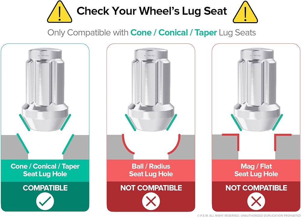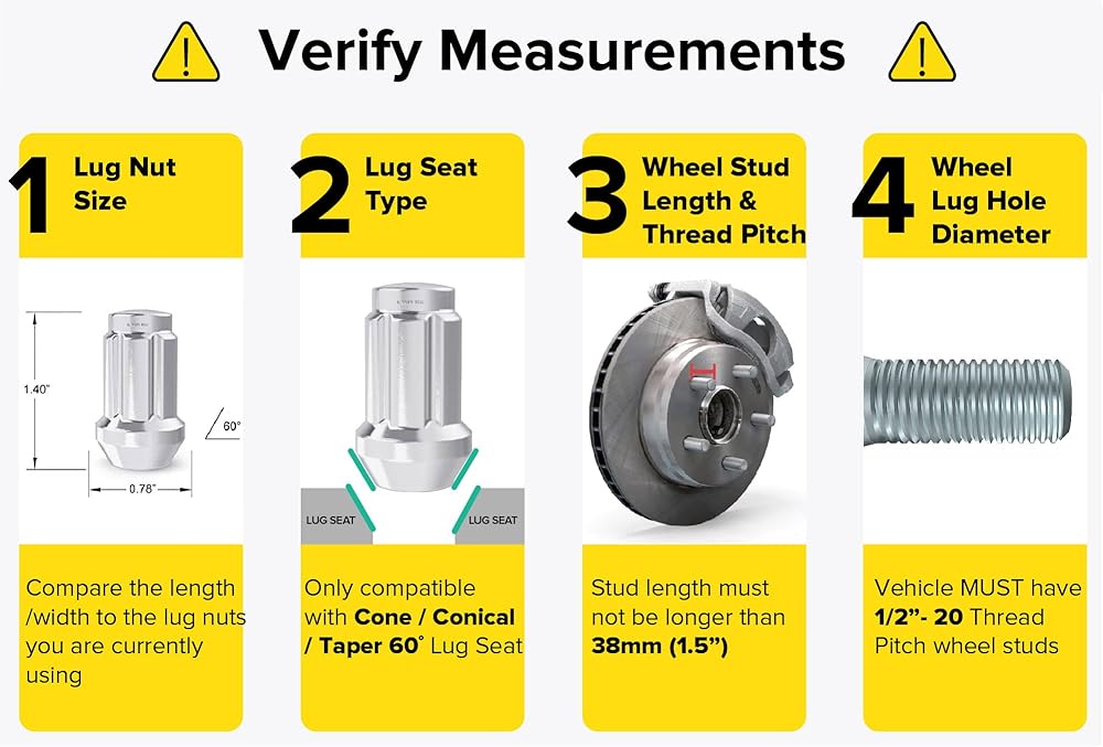 [Safety and Installation] Wheel hardware is an important safety component. Ensure these lugnuts are the proper size (length & width) before installing. Failure to install correct hardware is unsafe and may cause wheel/tire assembly to loosen or fall off while vehicle is in motion. Torque wrench is required for a safe installation. You'll also need a 19mm (3/4") Hex Socket Key Tool.