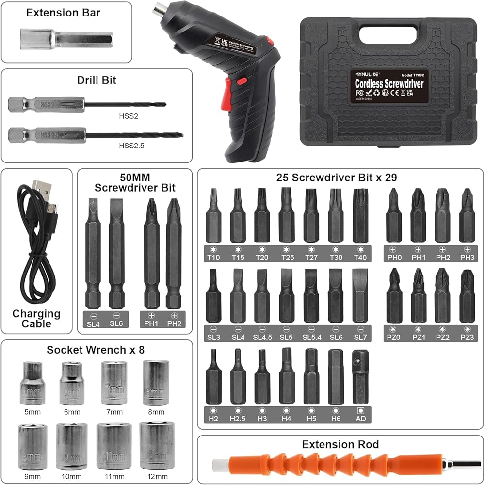 [ 47 pcs Accessories -- Cordless Electric Screwdriver--GIFT IDEA ] You will get: 1 x 3.6V electric screwdriver, 1 x magnetic soft shaft, 29 x 25mm screwdriver bit, 4 x 50mm screwdriver bit, 8 x socket wrench, 2 x drill bit, 1 x screwdriver bit extension rod, 1 x BMC case , 1 x user manual, 1 x charger. Torque screwdriverdelivers a powerful 3N/m max torque and a high-speed of 250 RPM for a wide range of drilling and quick fastening, Ideal for Furniture Assembly, Home DIY Projects.