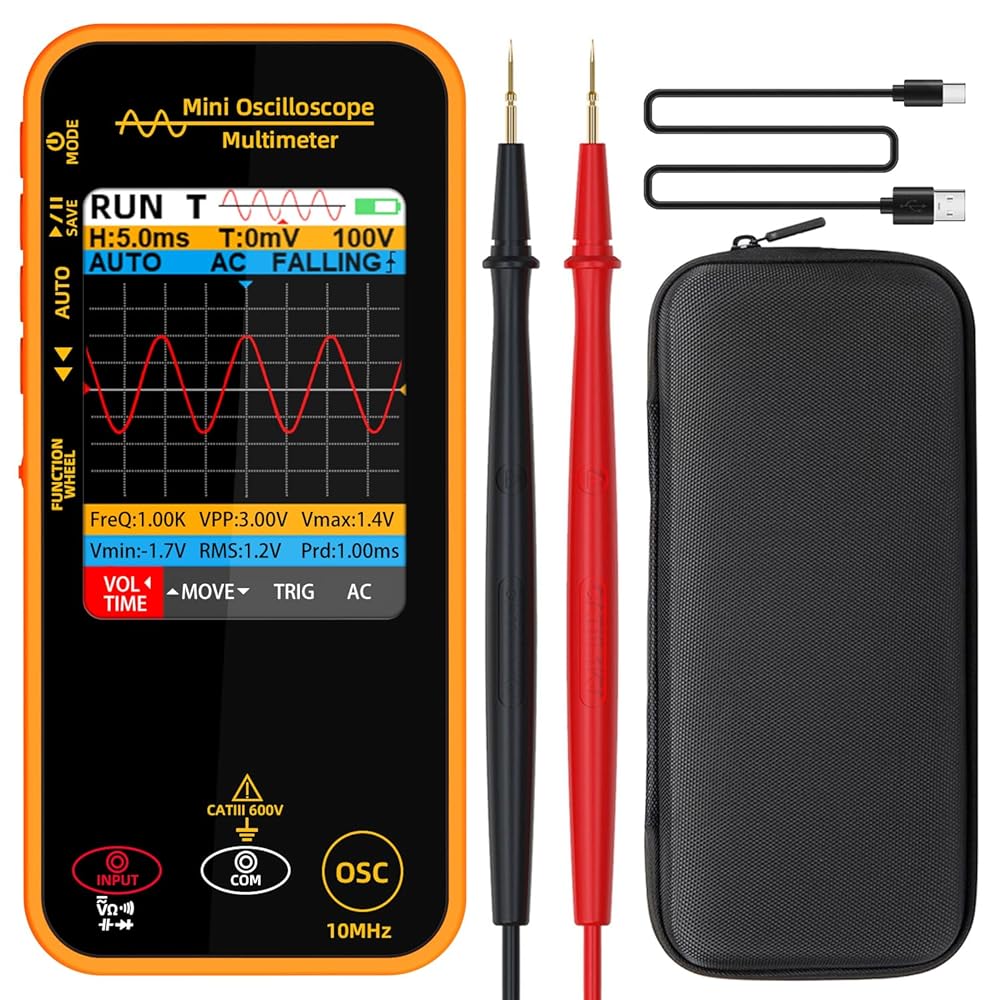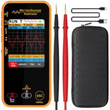 Features: 2-in-1 oscilloscope multimeter Handheld color display voltmeter Rechargeable graph Multimeter True rms digital multimeter tester Measures capacitance, ac and dc current, diode and continuity Measures ac and dc voltage, resistance, a-alert and live wire check Tested data can be saved and exported to your computer Low battery indication with flashlight design Specifications: MAX Display: 6000 counts Screen Size: 2.8 inch Bandwidth: 10MHz Real-time sample rate: 48MSa/s Input Impedance: 1MΩ,@16pf Maximum input voltage: 300V (DC+AC peak) Horizontal SEC range: 100ns/div -20s/div Vertical sensitivity: 20mV/div -100V/div DC voltage: 60mV 0.01mV (1%+5); 600mV/6V/60V 0.1mV/0.001V/0.01V/ (0.8%+3); 600V 0.1V (1%+5) AC voltage: 60mV 0.01mV (1.2%+5); 600mV/6V/60V 0.1mV/0.001V/0.01V/ (1%+3); 600V 0.1V (1.2%+5) DC current: 6A/10A 0.001A/0.01A (1.2%+3) AC current: 6A/10A 0.001A/0.01A (1.2%+3) Resistance: 600Ω 0.1Ω (1.2%+5); 6kΩ/60KΩ/600KΩ 0.001KΩ/0.01KΩ/0.1KΩ (1.0%+3); 6MΩ 0.001MΩ (1.2%+5); 60MΩ 0.01MΩ (1.5%+5) Capacitance: 99.99nF 0.01nF (5.0%+20); 999.9nF/9.999µF/99.99µF/999.9µF 0.1nF/0.001µF/0.01µF/0.1µF (4.5%+5); 9.999mF/99.99mF 0.001mF/0.01mF (5.0%+10) Diode: Measures diodes within 3V Continuity: Yes V-Alert(non-contact voltage detection): Yes Power: 2000mA battery (rechargeable) Size: 187 x 74 x 40.5 mm Weight: 269g Package Includes: 1 x Handheld Oscilloscope Multimeter 1 x Test Leads 1 x Carrying Case 1 x Charging Cable 1 x User Manual
