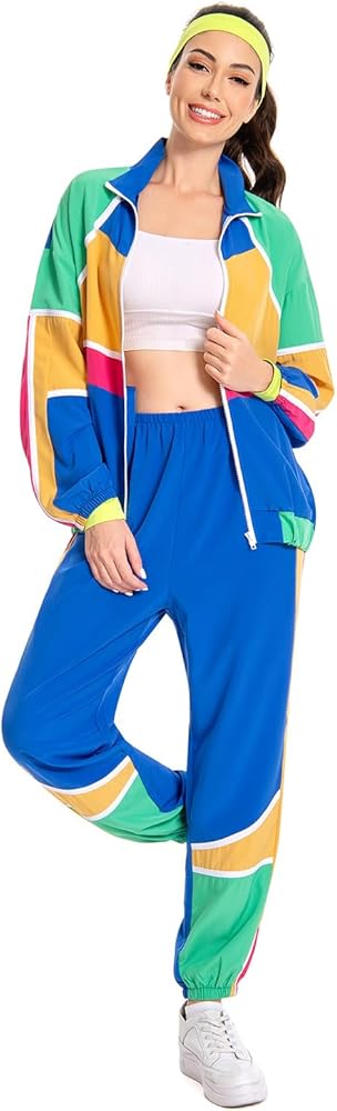 Womens 80s Tracksuit Retro Hip Hop Windbreaker Women Disco Tracksuit Sets Colorblock One Piece Outfits Set.