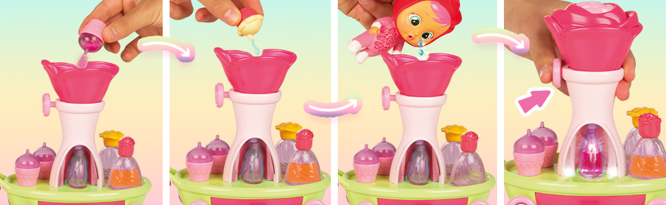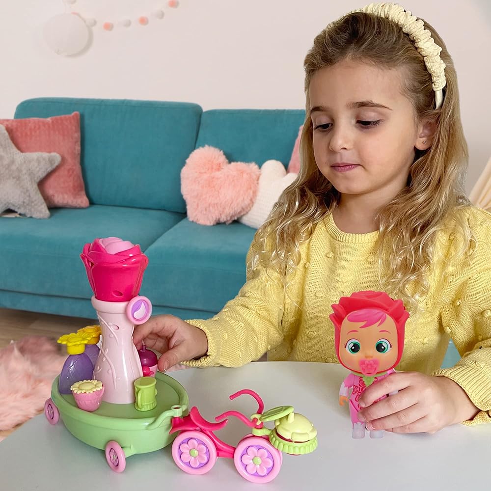 The Cry Babies Magic Tears Happy Flowers Rose's Bike Cart playset will spark kids' imagination to create fun storylines from the hit series or create their own stories! In this incredible playset, kids will find all necessary accessories to create their own Cry Babies Magic Tears pretend perfumes, just like Rose in the series! The Happy Flowers playset comes with an exclusive Rose doll and over 17 accessories! Follow the recipes and magic tears, the main flower will light up, and the pretend perfumes will be created. Play with Rose and have fun creating pretend perfumes with more than 17 accessories included: a baby bottle, a pacifier, a hand mirror, a watering can, 4 perfume bottles, 3 colorant containers, a bike with megaphone and GPS, a necklace and a mini perfume bottle!