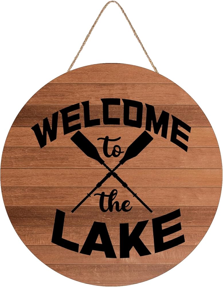 12 "X12" Round Wooden Signb for Front Door Decoration, Welcome to The Lake Wooden Sign Door Hanging for Farmhouse Porch Living Room Bedroom Front Door Kitchen Garden