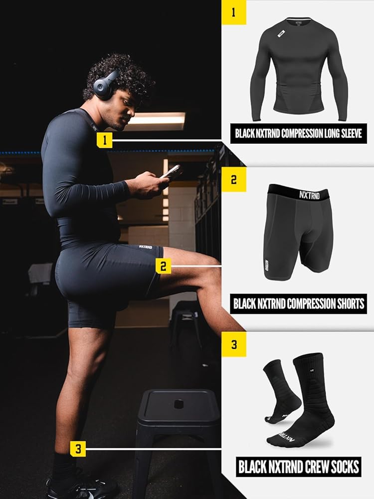 Nxtrnd's Core Compression line is our signature performance baselayer. Being football focused, we made it extra comfortable by incorporating sweat wicking capabilities and 4-way stretch materials, allowing you to move freely no matter the situation. Our super-light polyester blend fabric delivers a stretchy and comfortable fit without the added weight of cotton. the mesh paneling placed in sweat prone areas allows the mens tights to stay dry no matter the intensity of your training. Legging material wicks sweat & dries really fast. Ergonomic design keeps seams away from high abrasion areas & increases durability. Tight fit makes for the perfect football leggings and football compression shorts. Ultra-tight, second-skin fit. 85% Polyester/15% Spandex.