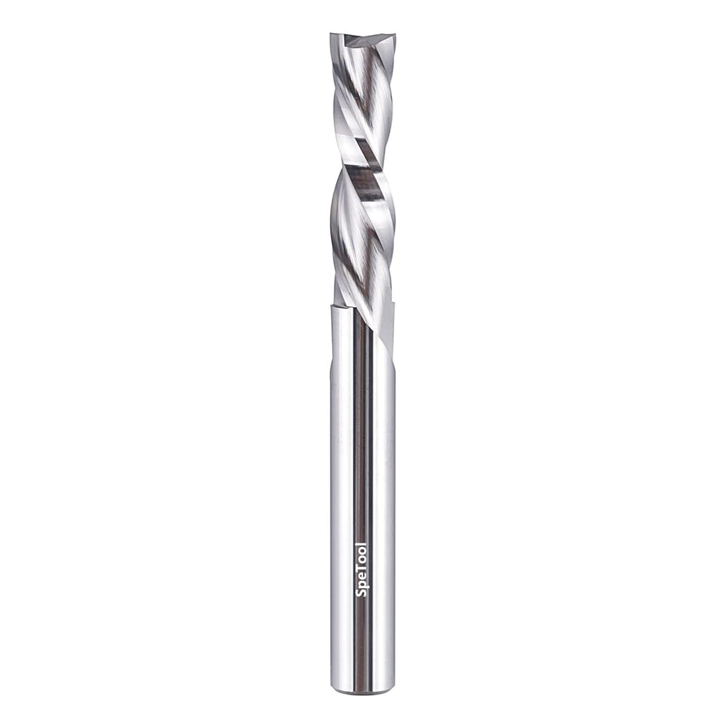 Solid carbide spiral router bit with 1/4 inch shank and 1/4 inch cutting diameter, 1 inch cutting length, 2-1/2 inch for total length