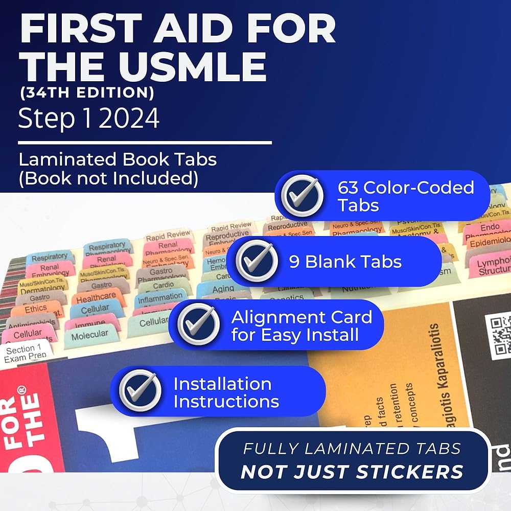 Book Tabs for First Aid for The USMLE Step 1 2026 36th Edition. Laminated, Color-Coded and Repositionable with Alignment Card for Easy Installation (Book not Included)