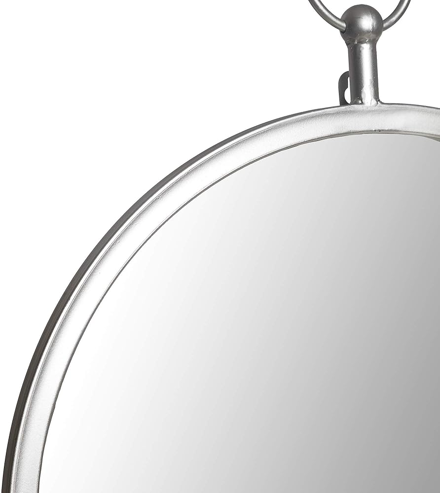 Add a vintage element to your decor with this Black Round Wall Mirror with Decorative Handle. Inspired by the classic pocket watch design, this mirror features a thin gunmetal frame and loop handle embellishment at the top. Mirror measures 18 inches in diameter and top handle measures 4.5 inches. Hang it securely to any wall with industrial hangers on the back. Unique enough to add as an accent piece to your farmhouse decor, yet large enough to make for a focal point above the mantel. Mirrors provide the illusion of a larger space while also adding bright reflective shine. This mirror is no exception with it's playful yet vintage design.