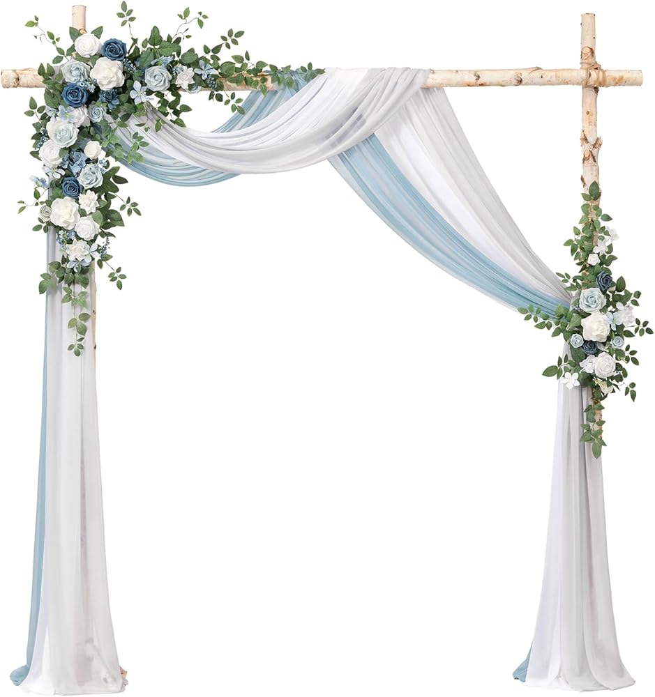 EASY TO INSTALL: Pre-made and ready to use. Following the video guideline, inspect the package contents and use steam to arrange the artificial arch flowers, curtain drapes and other decor. Package only includes:1 corner flower; 1 tieback flower; 3 polyester drapes;6 green zip ties (wood arch stand NOT INCLUDE).