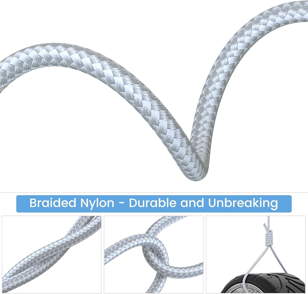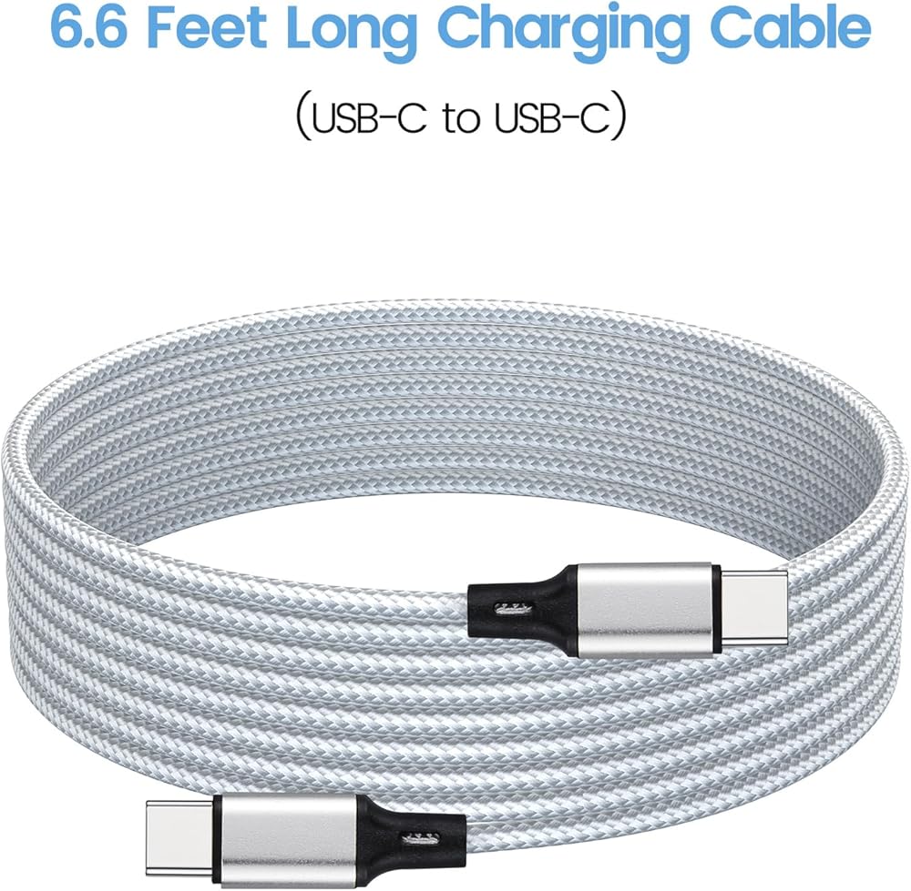 USB C to USB C cable, silver mix white, made up of braided nylon, steady and unbreakable; Supports quick charging; 6.6 feet / 2 meters long