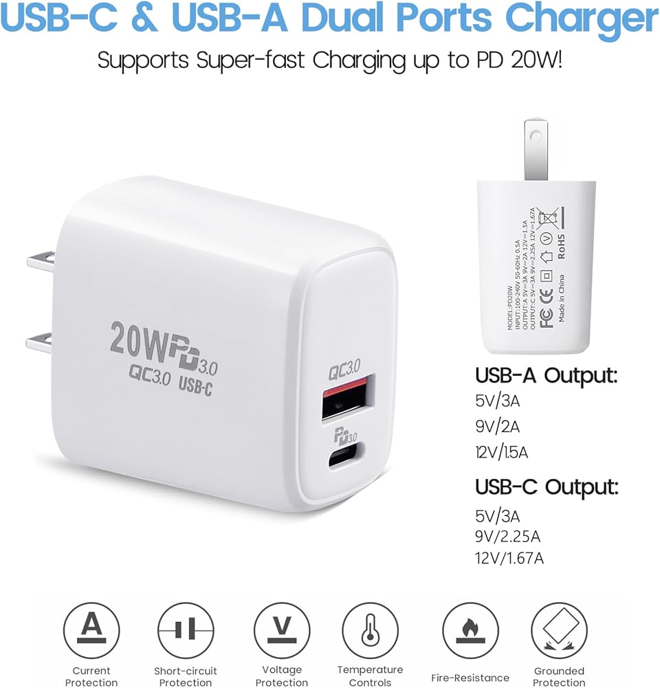 White ABS wall charger, supports PD 20w fast-charging; Built-in smart IC chip-set to prevent short circuit, with over voltage and current protection
