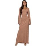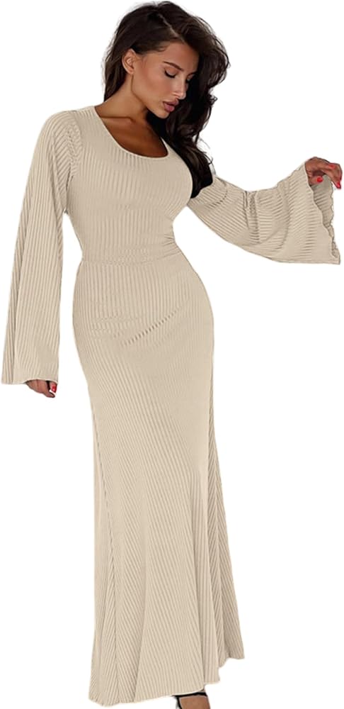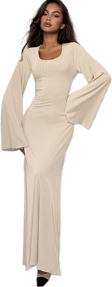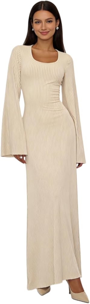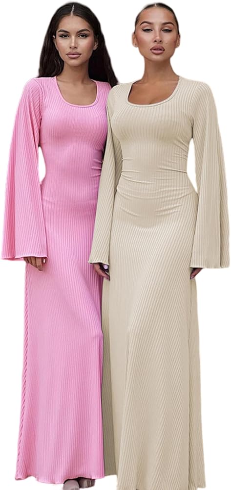 2) This long dress features scoop neck, ribbed knit, flared long sleeve and floor length.