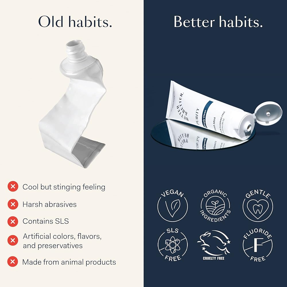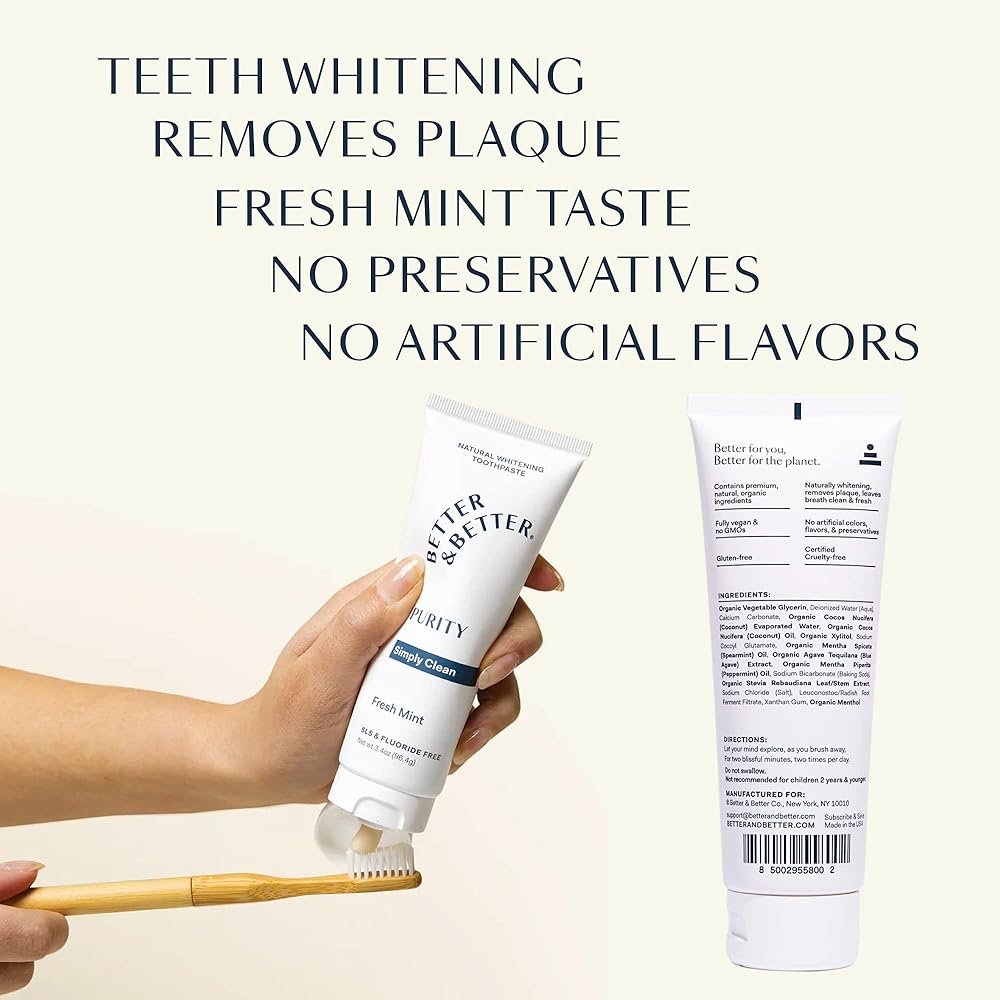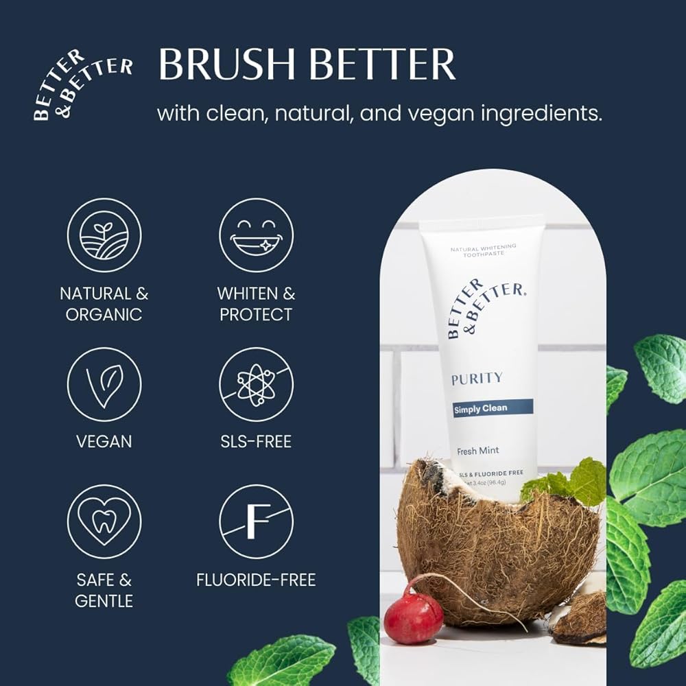 In With the Better - Made with clean, non-toxic, and vegan ingredients you recognize, you can now brush better with Purity. Our clean toothpaste's unique formulation includes organic coconut oil, organic blue agave, organic stevia, organic menthol, organic xylitol, organic spearmint, organic peppermint, salt, and baking soda. It's also cruelty-free and made in the USA.
