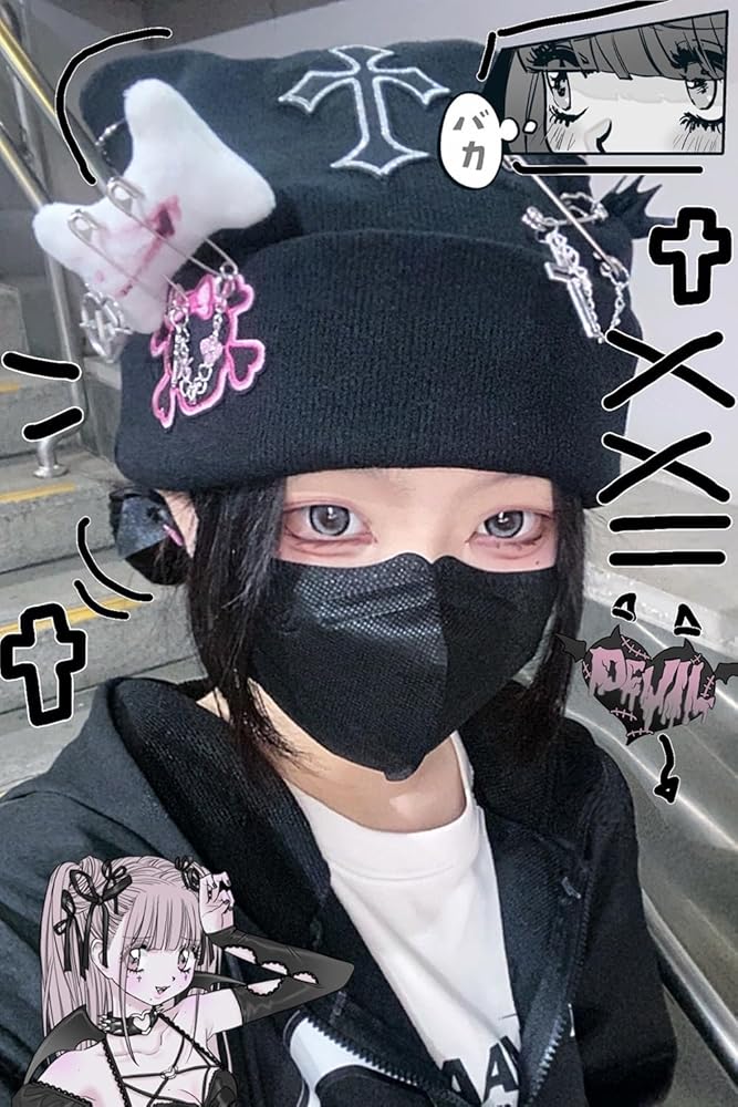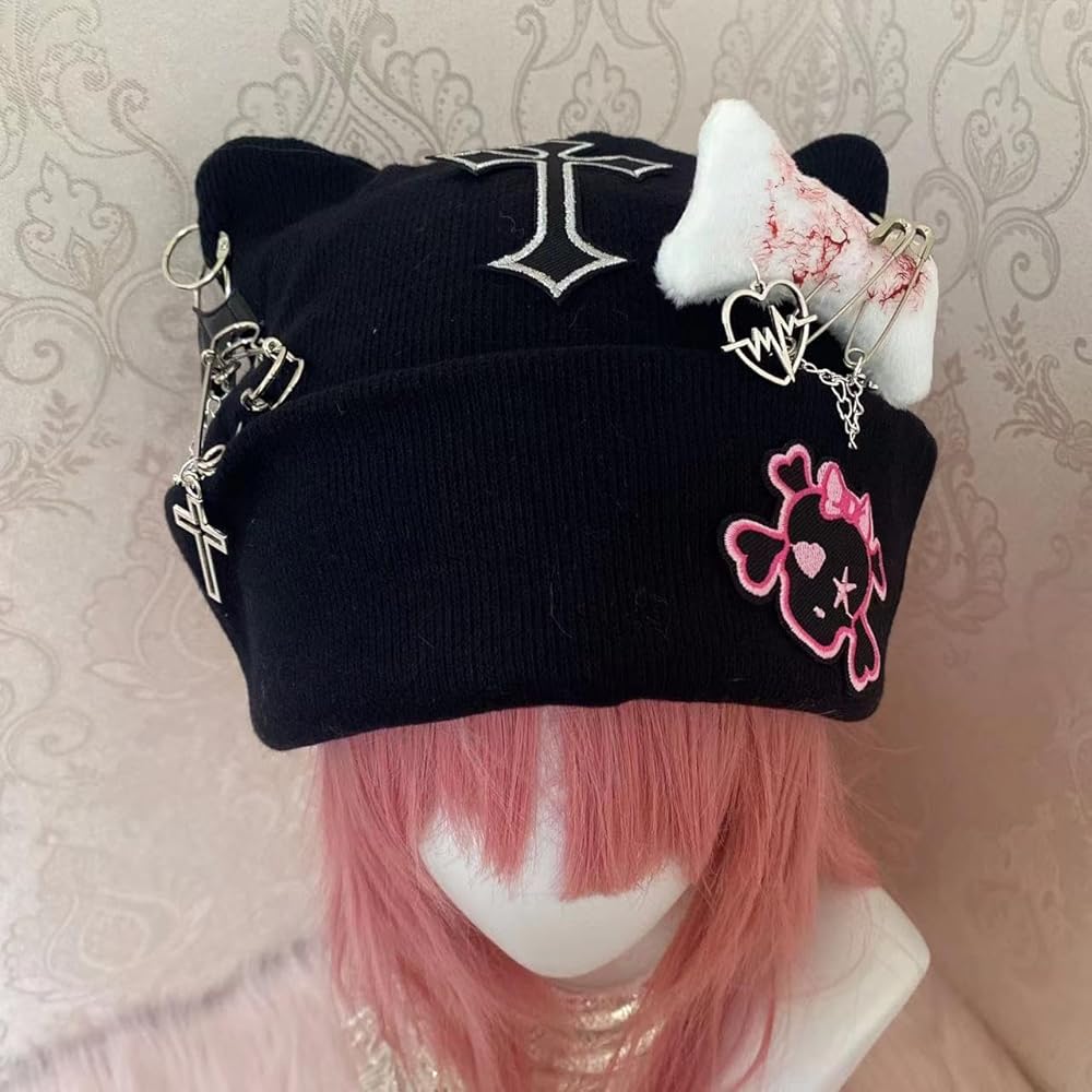 CAT KO Cross Black Beanie Hat Goth Cat Ear Hat Y2K Accessories Grunge Hat Crochet Knitted Hats for Women Girls