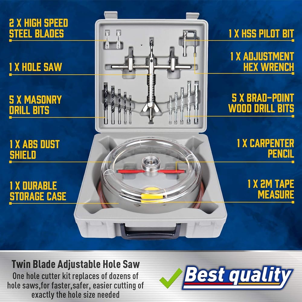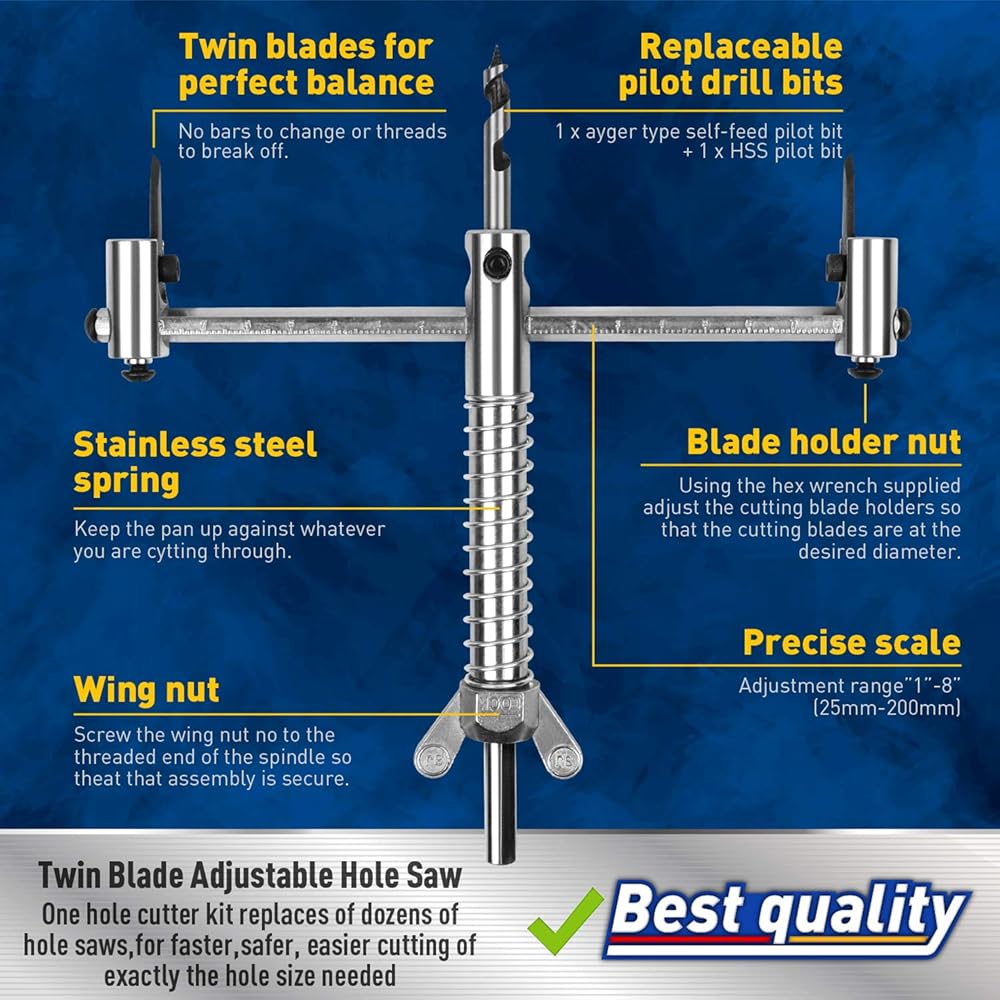 [SIZE ADJUSTABLE]:Double blade hole cutter applied 1-5/8" to 8" (40 - 200mm) holes with depth up to 3/4"(19mm) from one side, 1-1/8"(30mm) from two sides.