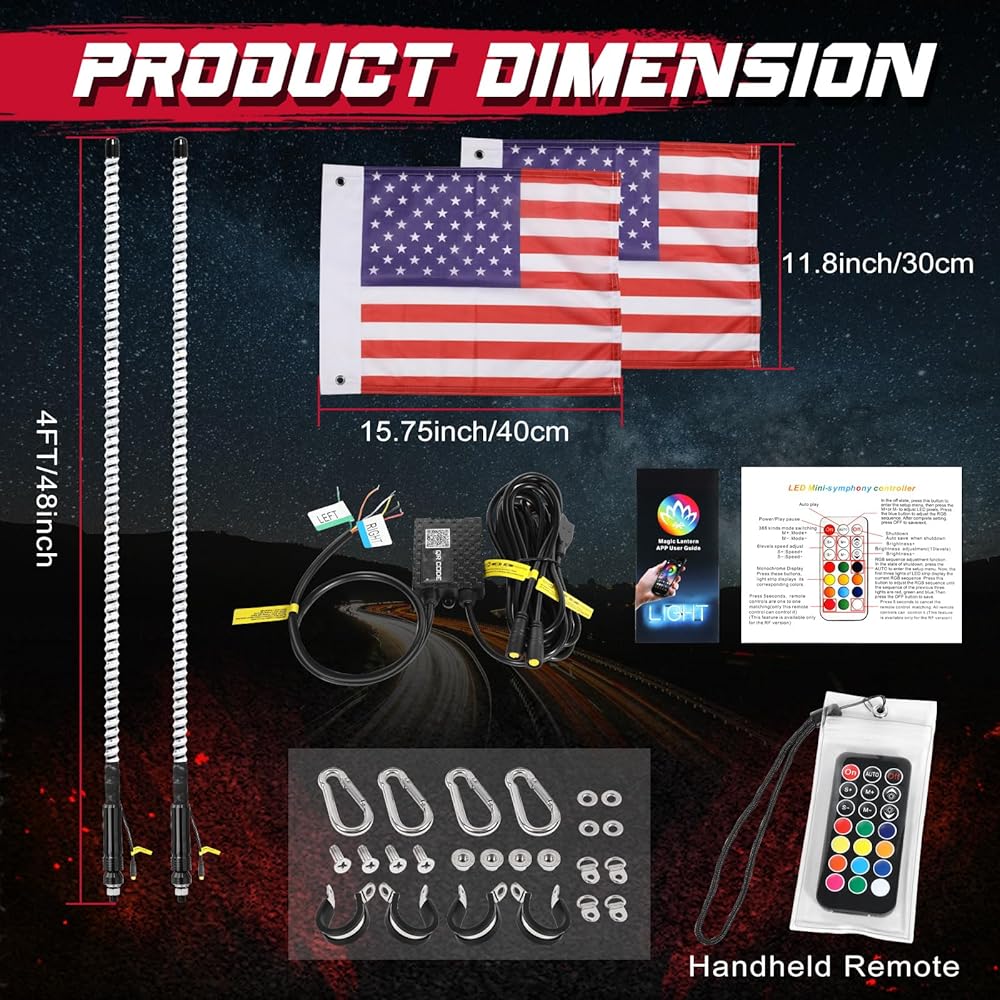 PACKAGE INCLUDE - 2* 4ft LED Whip lights, 2* flags, 1* remote comes with instruction, plug and play wiring harness and necessary mounting accessories for easy installation. Secure OFFROADTOWN's 2 Years 100% Quality Assurance and 24/7 online support with your purchase. For any inquiries or assistance, please don't hesitate to contact us.