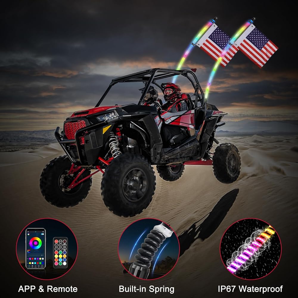 WIDE APPLICATION - Engineered to work seamlessly with any DC 12-15v vehicles and devices, the 4 feet lighted whips can be compatible with UTV, ATV, RZR, SXS, polaris, truck, jeep, can-am, golf cart, etc. Can be used as warning lights, signal lights, or chase lights to let those around you know exactly where you are to avoid something unkown.