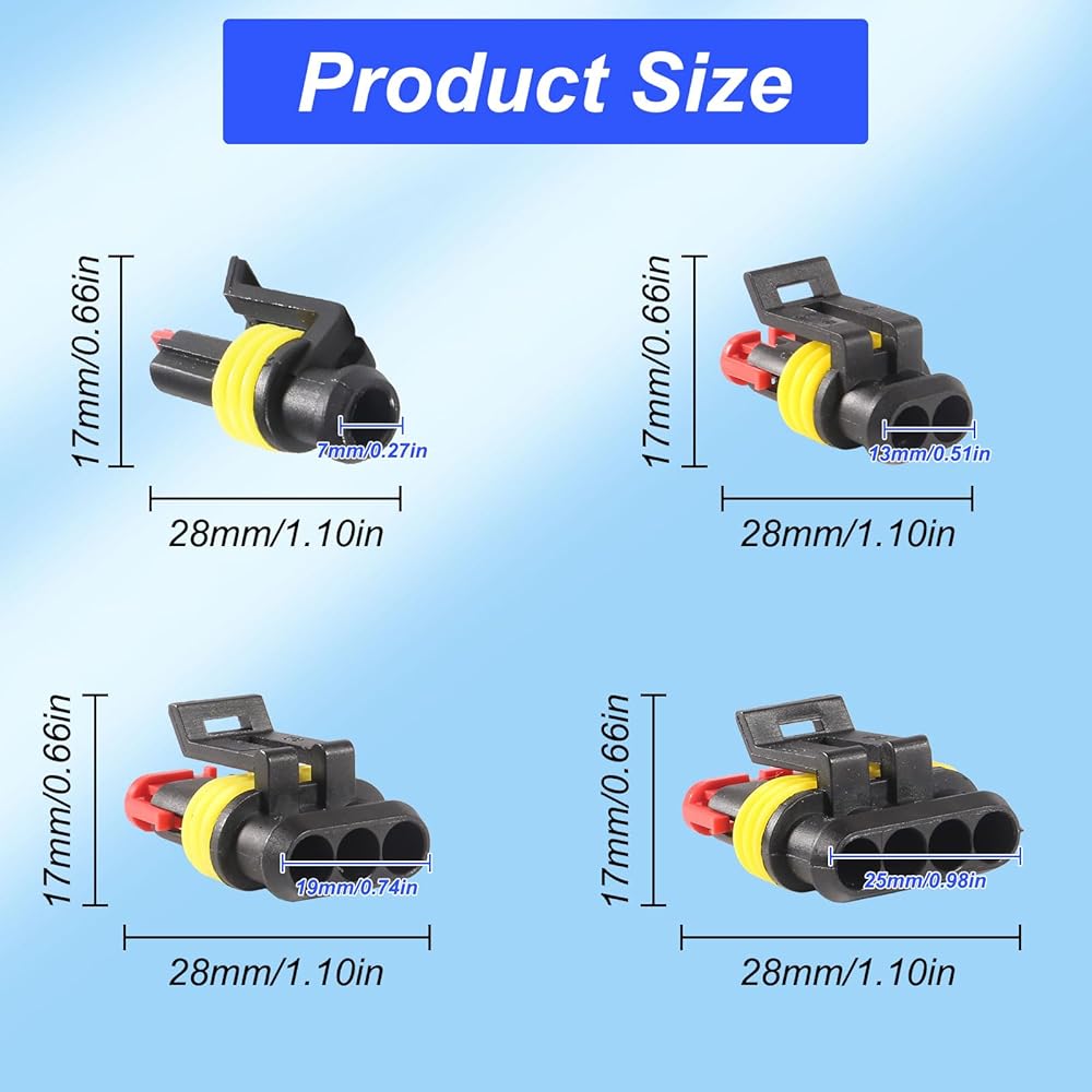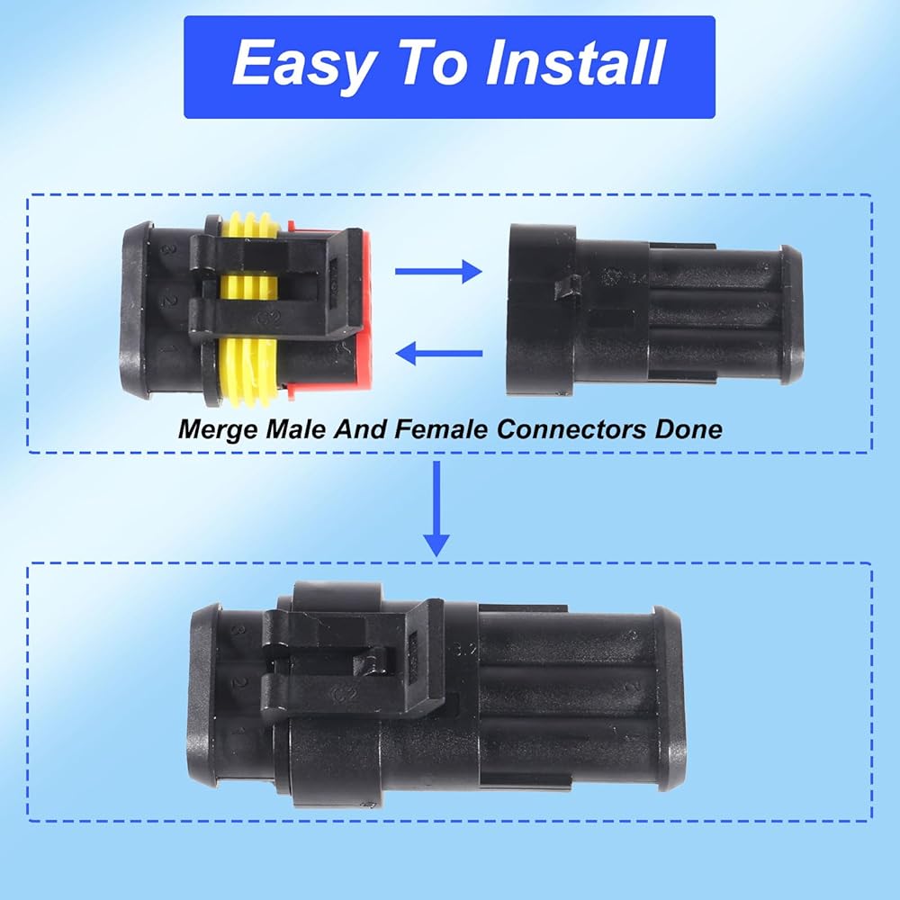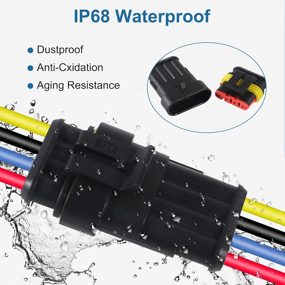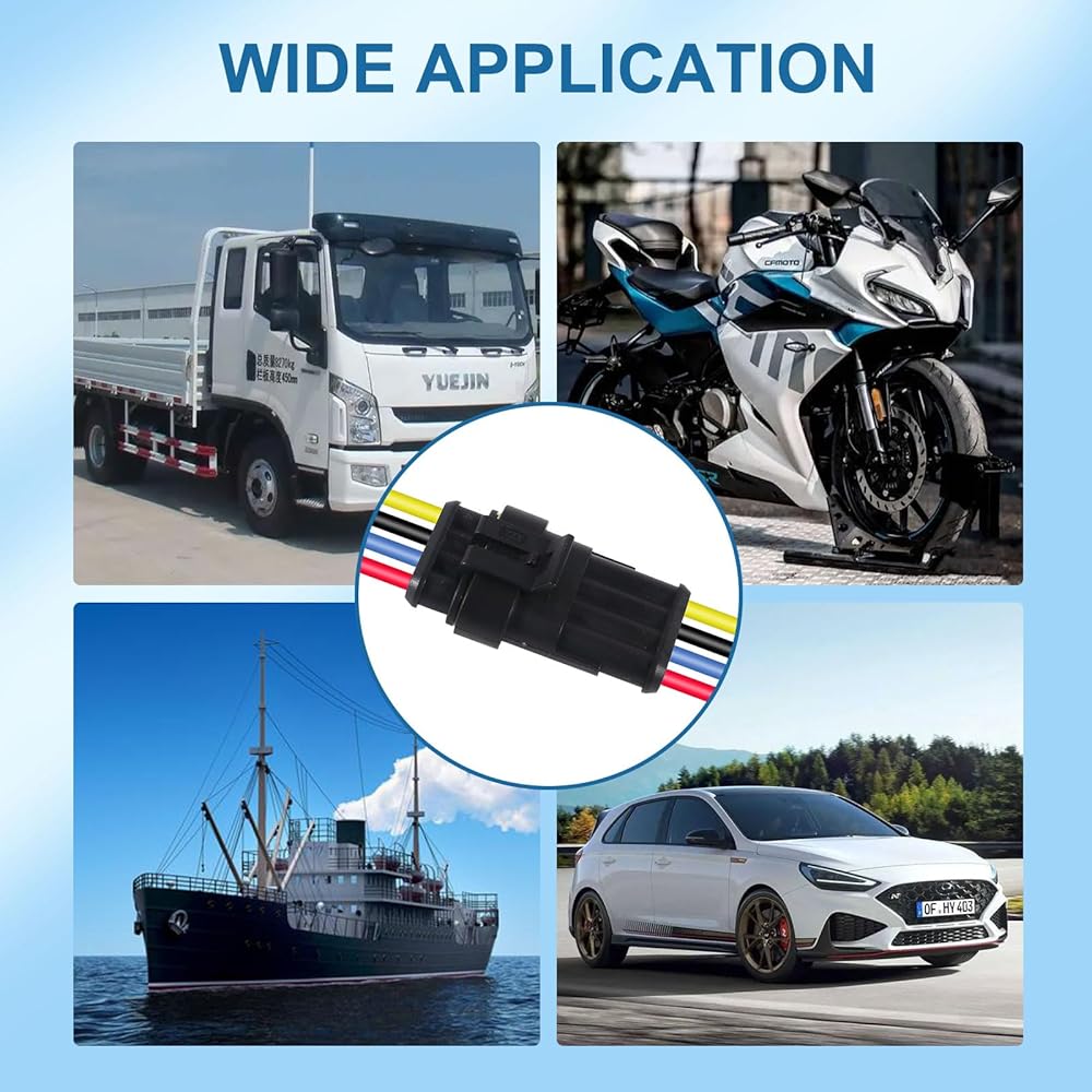 WIDELY APPLICATIONS: The automotive waterproof connectors are ideal for various wire connections in a variety of vehicles, including motorcycles, trucks, marine vessels, jet skis, scooters, cars, and boats, etc. With our reliable and efficient automotive wire connectors, we're confident that we can provide a valuable contribution to your needs.