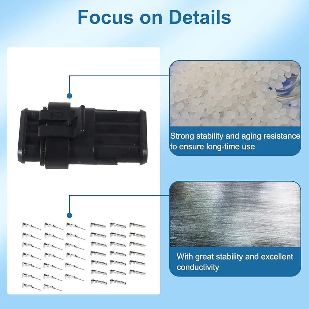 HIGH QUALITY: The automotive waterproof connectors are composed of top-notch PA66 materials and high-quality H62 brass terminals. They boast exceptional chemical stability, electrical conductivity, and oxidation resistance, ensuring optimal protection from water, dust, and other environmental hazards. What's more, the unique buckle design guarantees an accurate and complete insertion of the contact within the housing, preventing any potential slipping out of the electrical plug connectors.