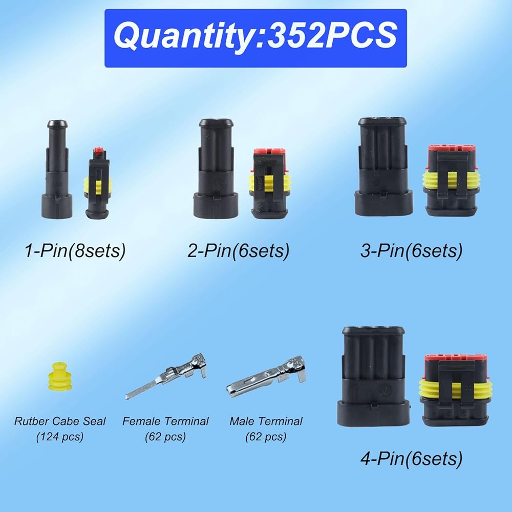352PCS WATERPROOF AUTOMOTIVE KITS: The kits includes 1 pin-8sets, 2 pin-6sets, 3 pin-6sets, 4 pin-6sets wire connectors. 1-4 pin 22-16 AWG waterproof connector: a total of 26 sets of automotive connectors waterproof are included, which can meet most of your needs. The waterproof electrical connectors with male & female terminal, silicone rubber cable seal and storage box.