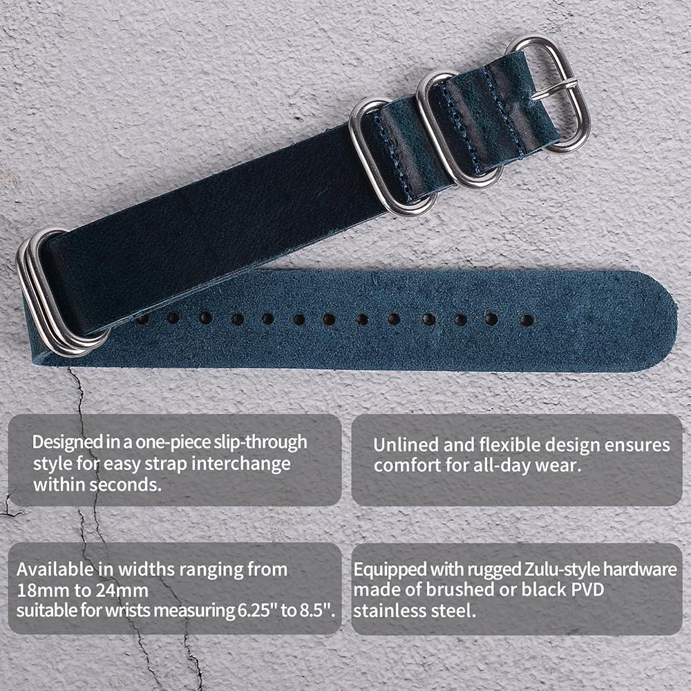 Premium Quality: Our one-piece zulu style genuine leather watch band is made from the finest top-grain cowhide leather, which is known for its exceptional quality and durability. The leather is carefully treated to retain its natural texture and beauty, ensuring that it looks and feels luxurious. This makes it resistant to daily wear and tear, ensuring that it maintains its beauty over time.
