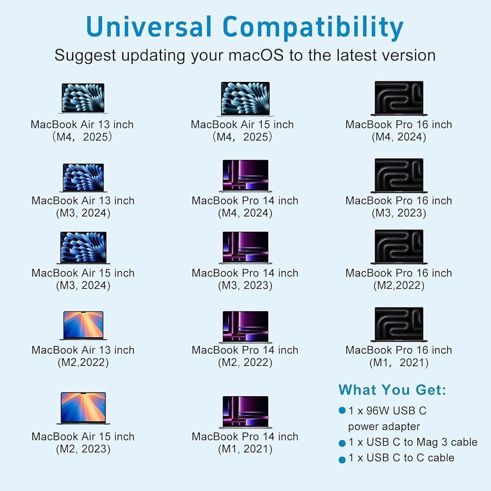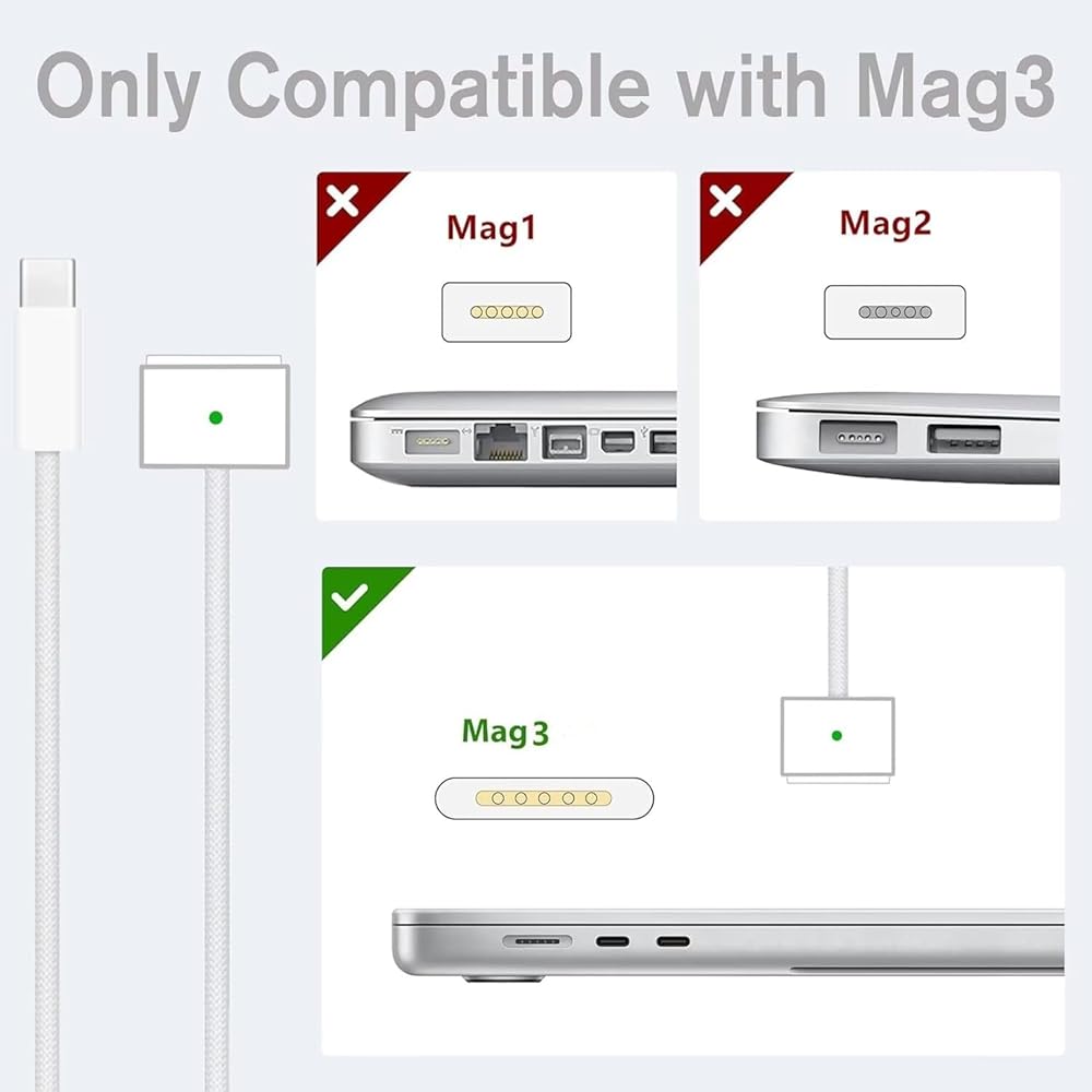 【Technical Specifications】Comes with the 6.6ft (2m) USB C to Mag 3 cable built-in emark chip, supports max 5A current through. Input: AC 100-240V-1.5A(1.5A), 50-60Hz; output: 96W/ 87W/ 61W/ 30W (PD 20.5V=4.7A; 20.2V = 4.3A; 20.3V=3.0A; 20V=2.25A; 20V=1.5A or 15V=2A), and this charger can automatically identify equipment and provide the fastest and most effective output current.Also compatible with all USB-C type C port laptop cellphone and ipad.(We also provide you with a PD3.1 USB C-C fast charging cable)