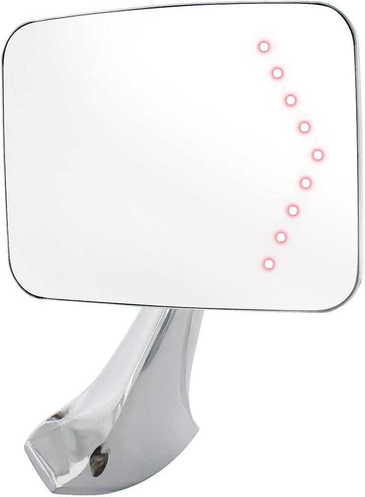 FEATURES: The United Pacific Exterior Mirror with Hidden Built-In Turn Signal Arrow features a diecast polished stainless steel mirror head and chrome plated arm. The Exterior Mirror features our hidden turn signal arrow giving the mirror a cleaner look. NOTE: If you look closely at it, you can spot the LED behind the mirror.